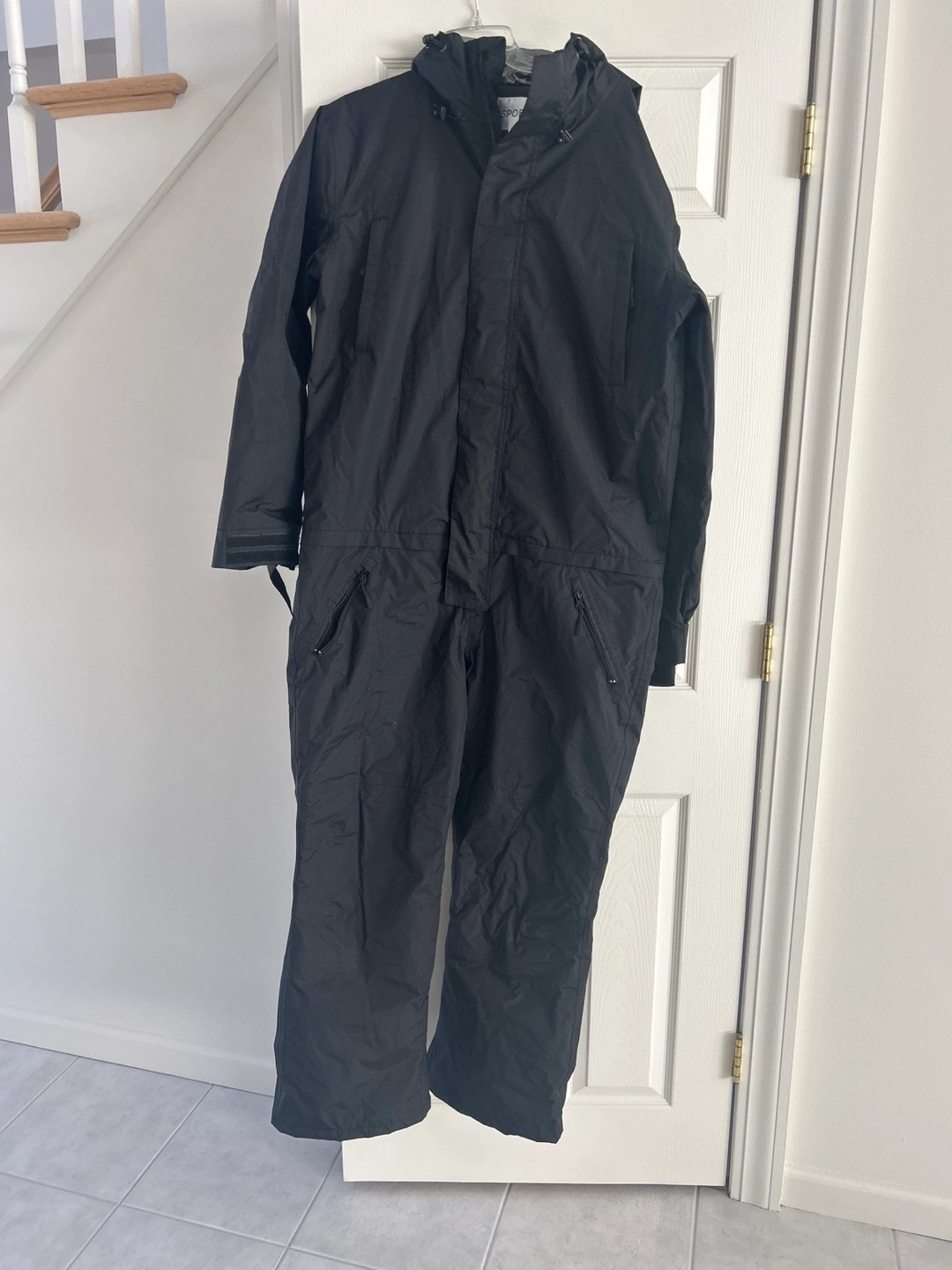 Men's black snowsuit. Full zip-up front. Attached hood. Multiple pockets. Size L/175. New