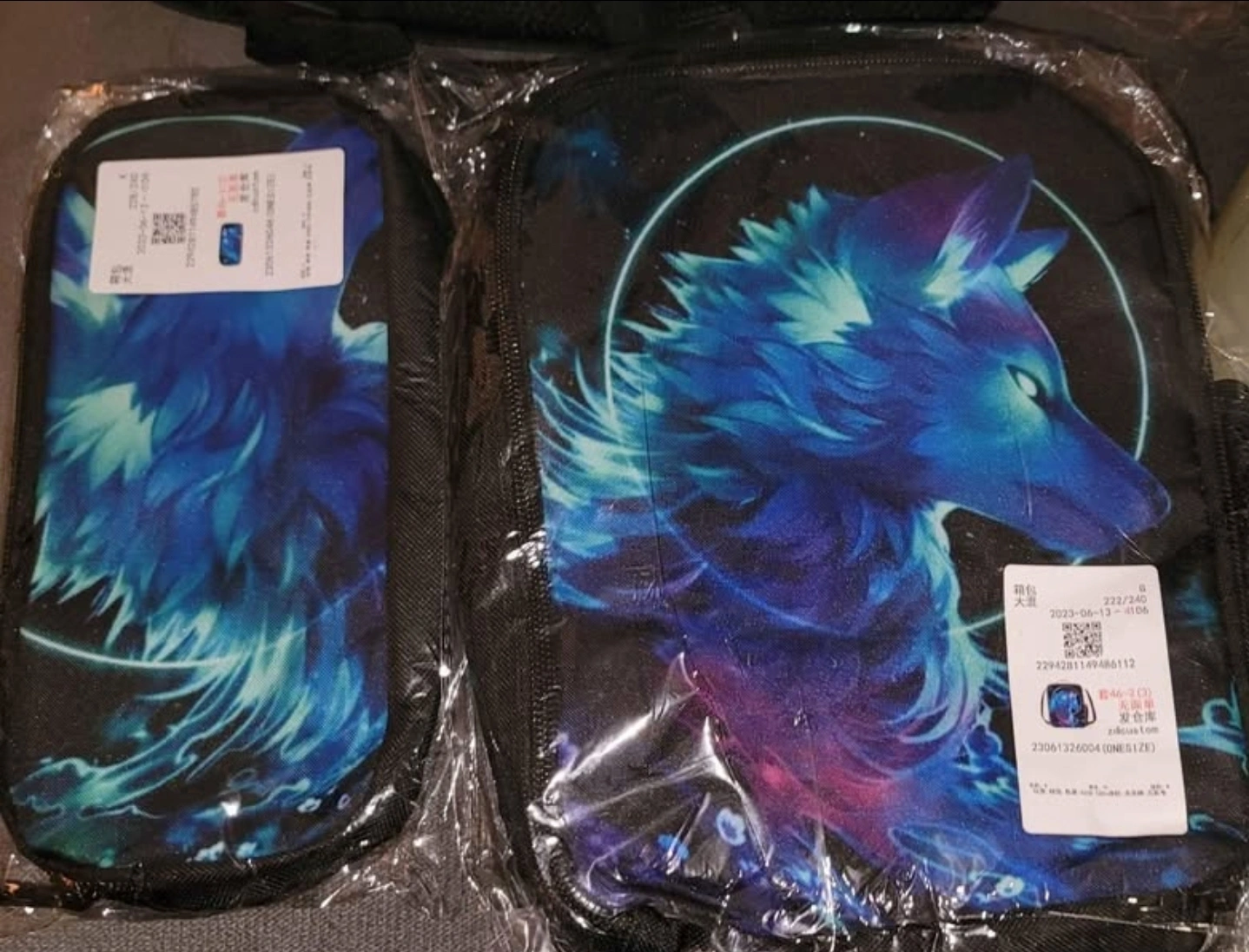 Black backpack, matching lunch bag, and pencil case. Blue wolf design. Great for school or everyday use. New with tags. Pickup in River Grove