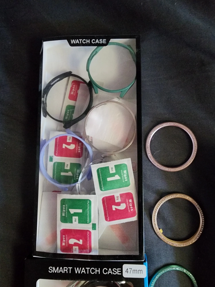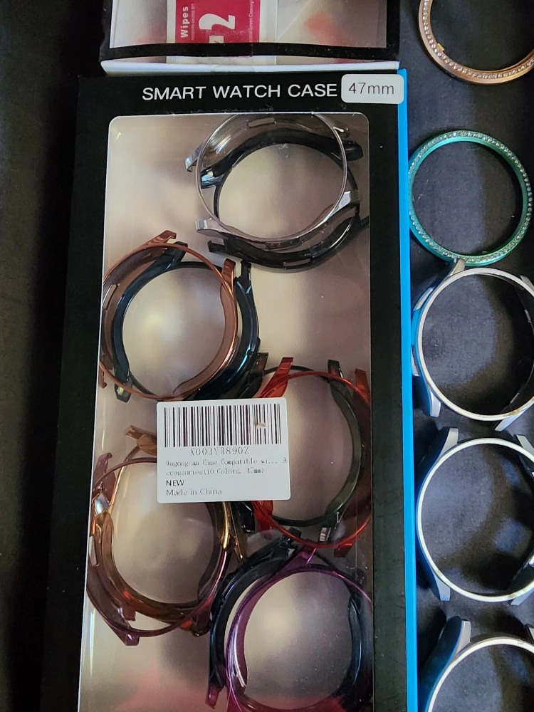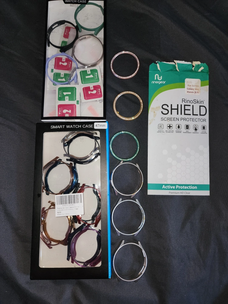 Multiple 47mm Samsung smart watch 6 cases. Various colors and styles. Rhinoger screen protectors included. New and unused.