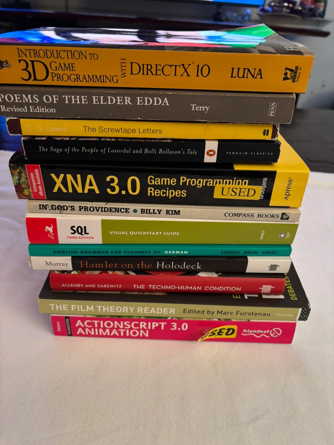 Collection of used 12 books. Topics include game programming, literature, religion, and more. Some books show light wear. Great collection All the books for $36 or $5 each