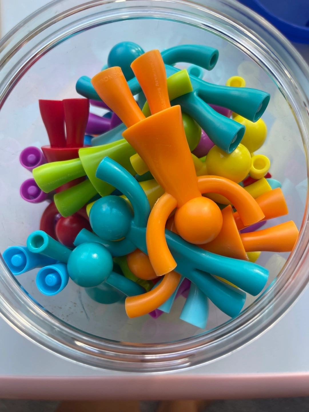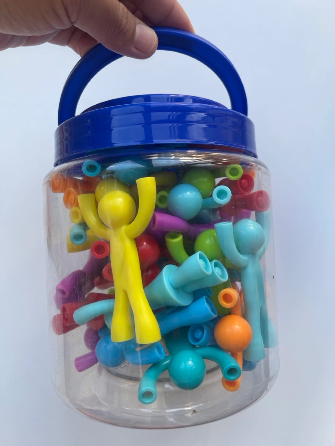 Colorful plastic construction toy. Lots of pieces. Great for creative play. Comes in a clear jar with a blue lid. Pre owned