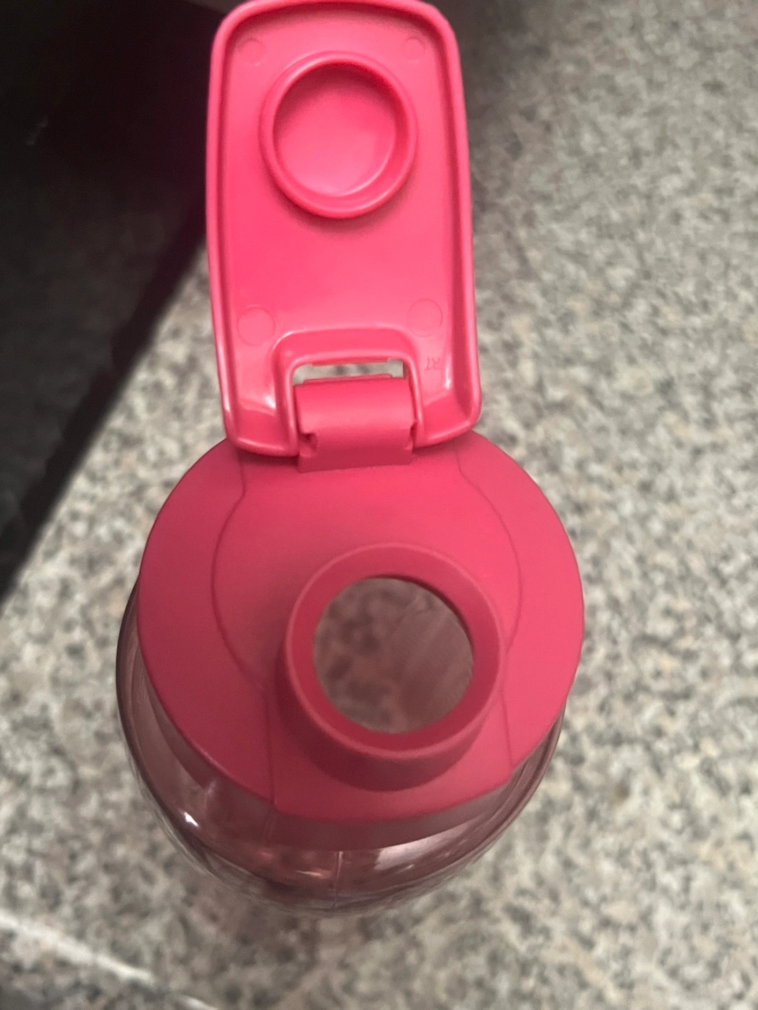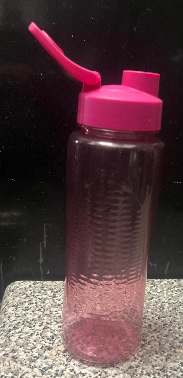 25oz capacity water bottle. Clear light pink body with a textured pattern. Pink lid and flip top. Great for hydration on the go. BPA free and lightweight.
