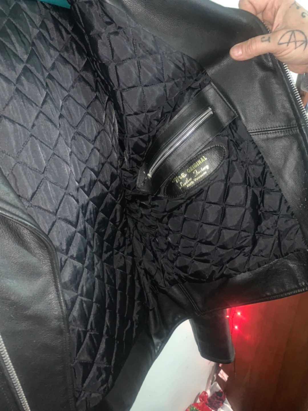 Black leather motorcycle jacket. Features zipper closure, quilted lining, and lace-up detailing at the cuffs. Shaker branding visible on the back. Great condition.