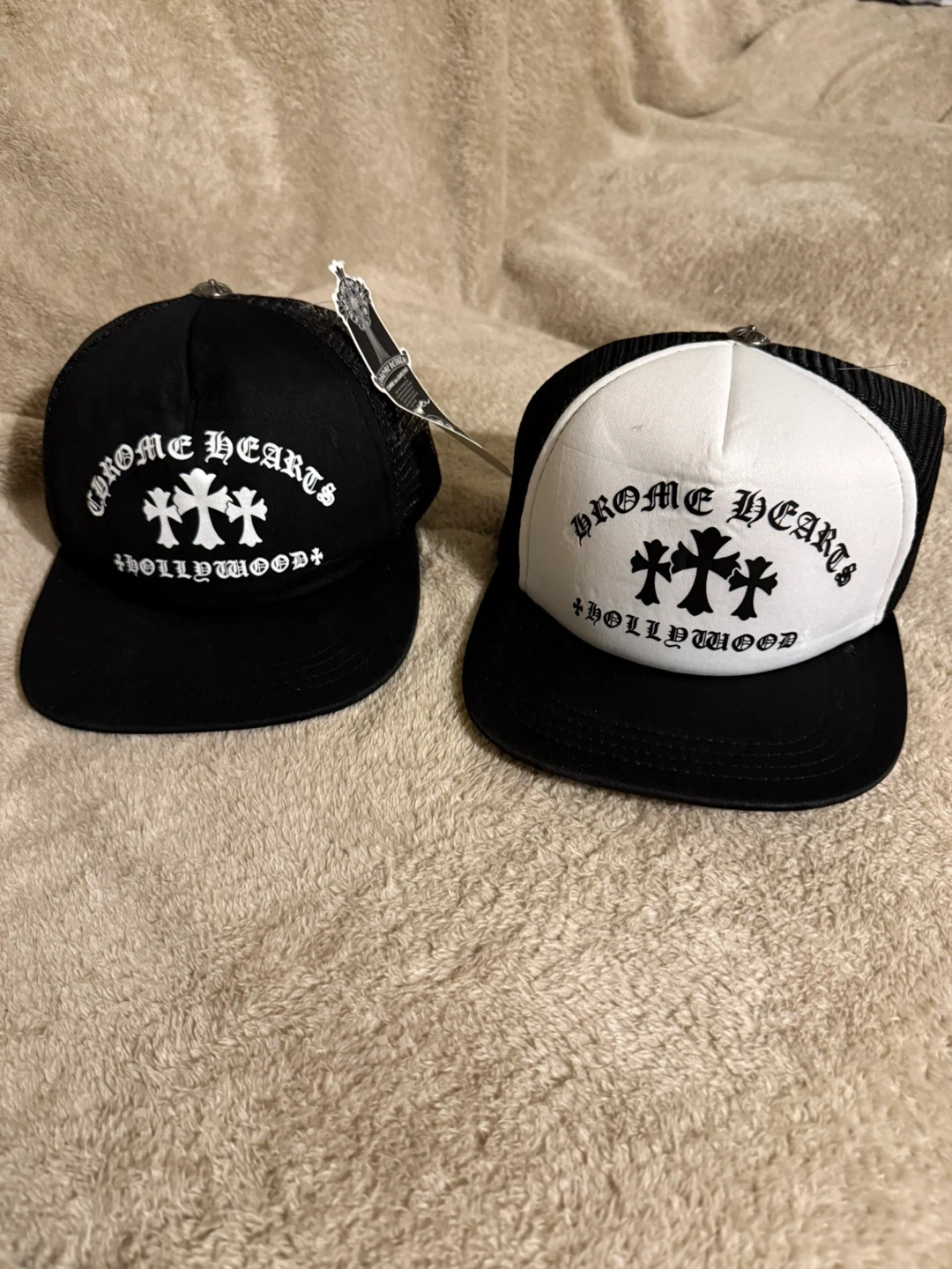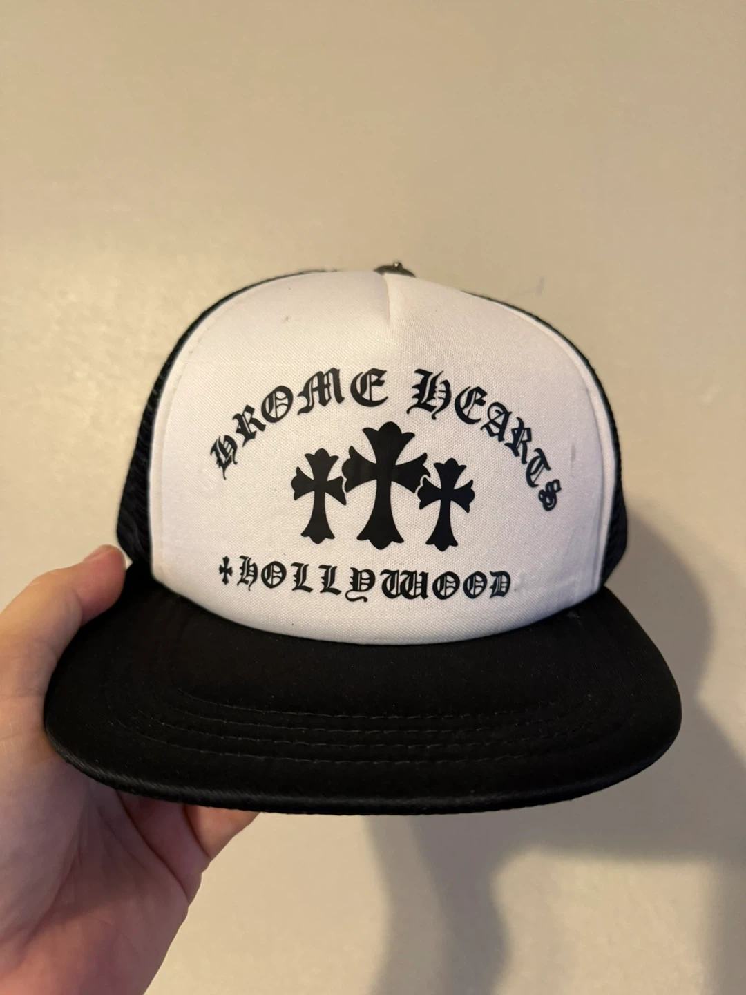 This is a Chrome Hearts trucker hat with "Chrome Hearts" and "Hollywood" branding. It features crosses on the front. The hat has a black brim and a white front panel with black mesh sides.