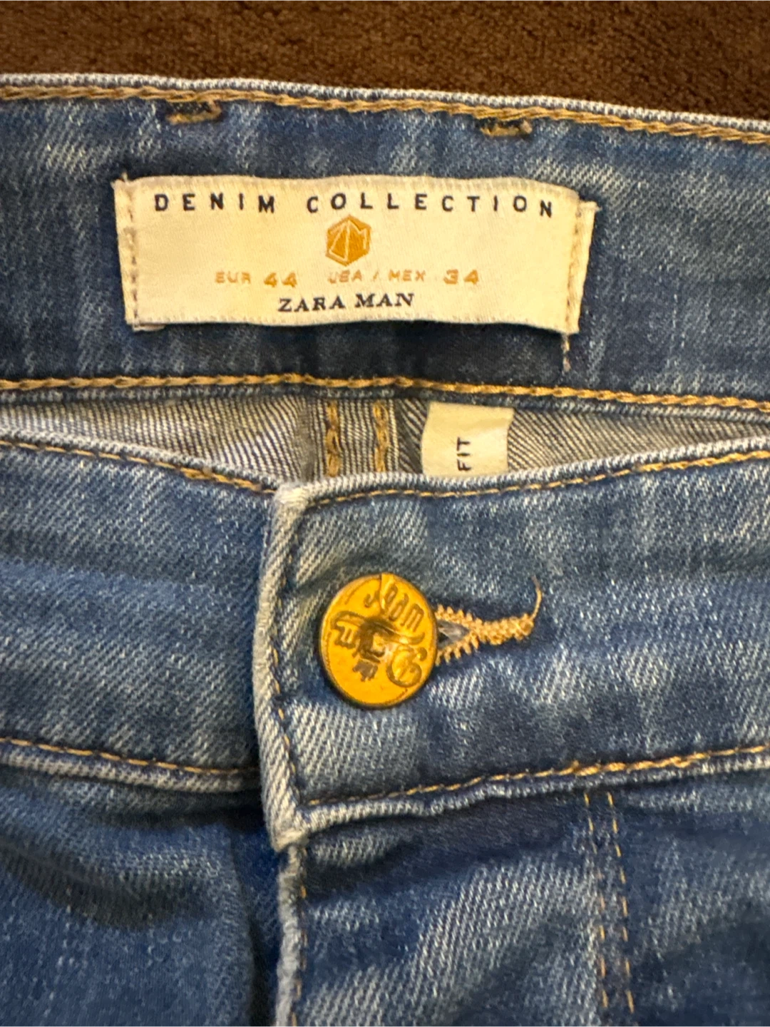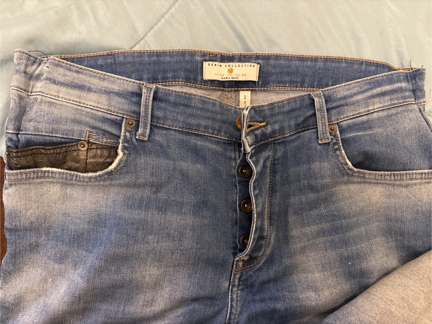 These are Zara Man denim jeans in a light wash. They feature a button-fly closure and distressed detailing on the legs. European size 44, USA/Mexico size 34.