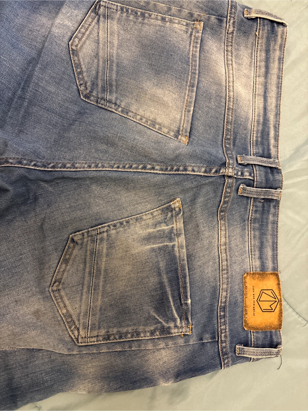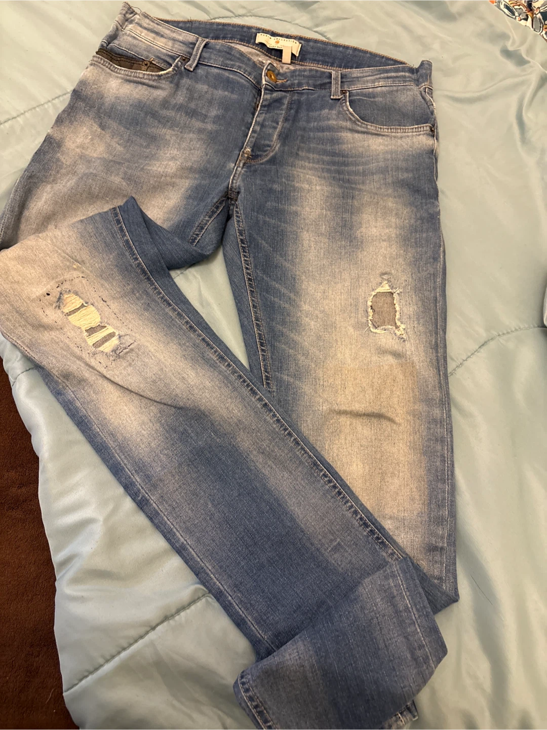 These are Zara Man denim jeans in a light wash. They feature a button-fly closure and distressed detailing on the legs. European size 44, USA/Mexico size 34.