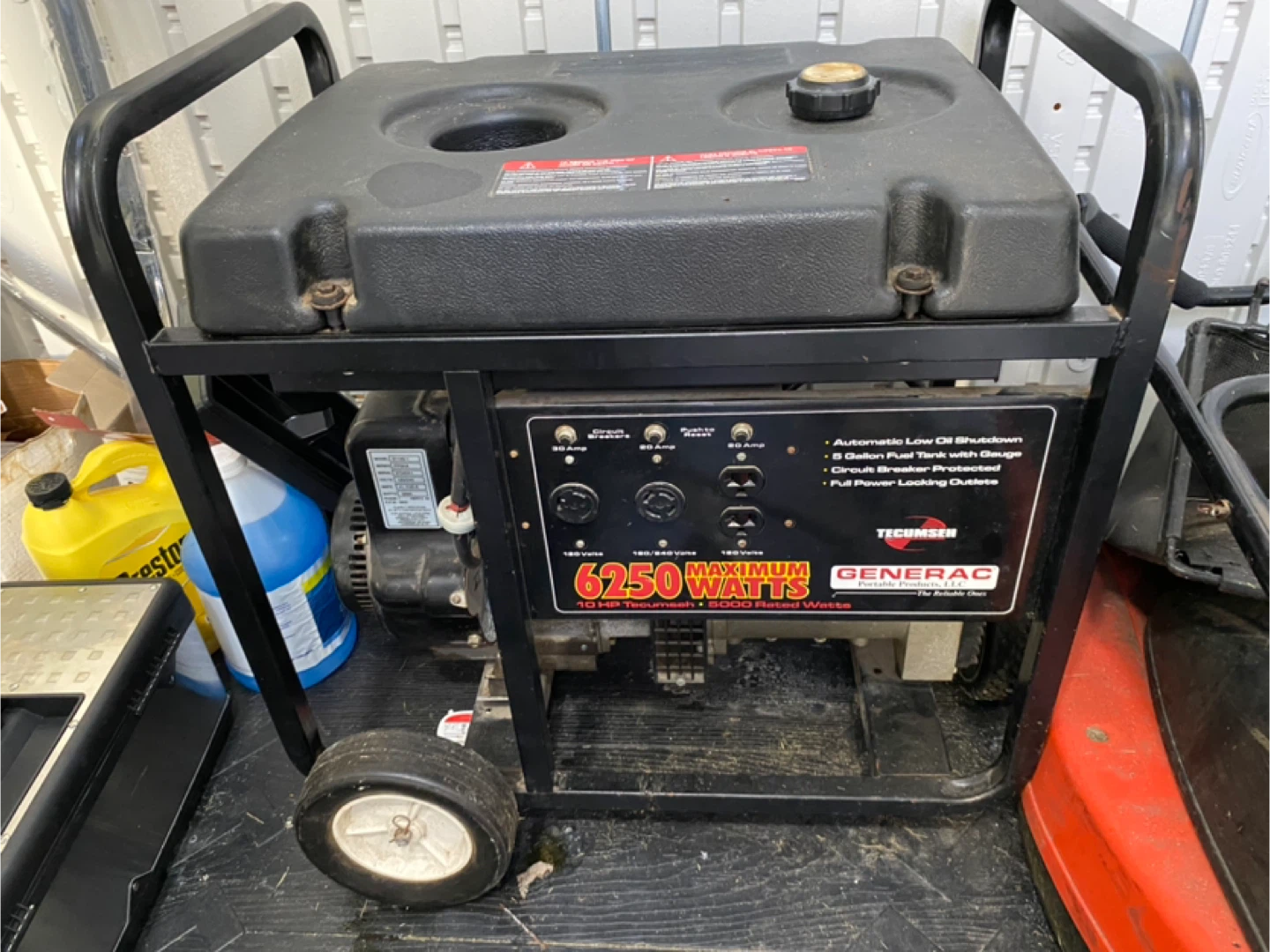 This Generac portable generator has 6250 maximum watts and 5000 rated watts. It features a 10 HP Tecumseh engine and a 5-gallon fuel tank with a gauge. It also has automatic low oil shutdown and circuit breaker protection. This generator is great for backup power during outages.