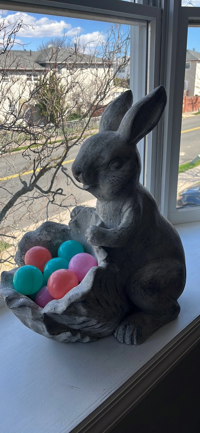15Gray stone rabbit figurine holding a leaf-shaped basket. Perfect Easter decoration.