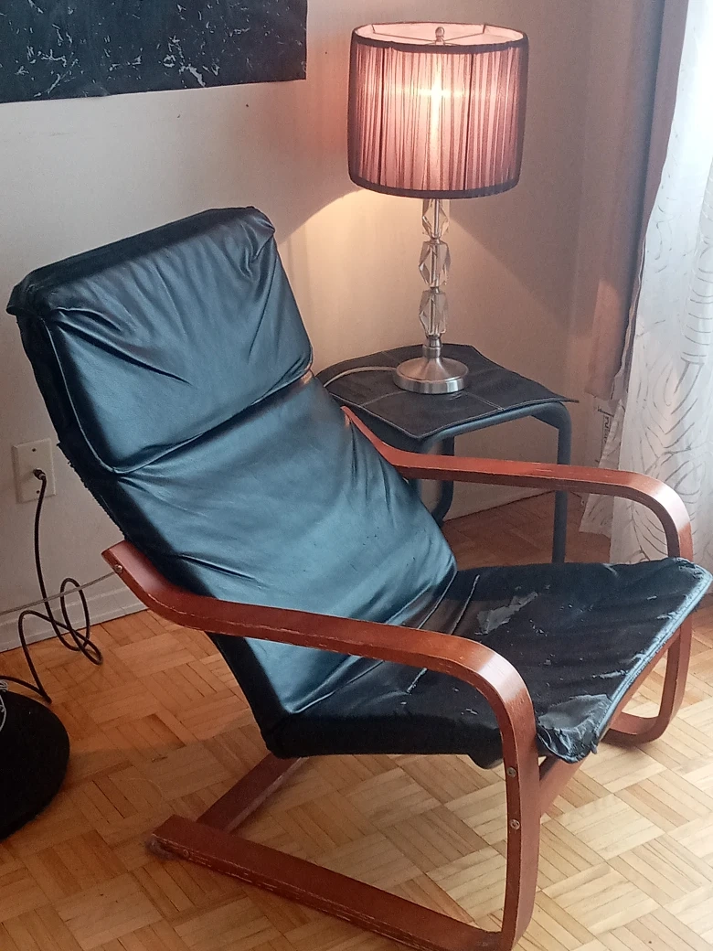 Black leatherette recliner. Wooden frame. Shows some wear.