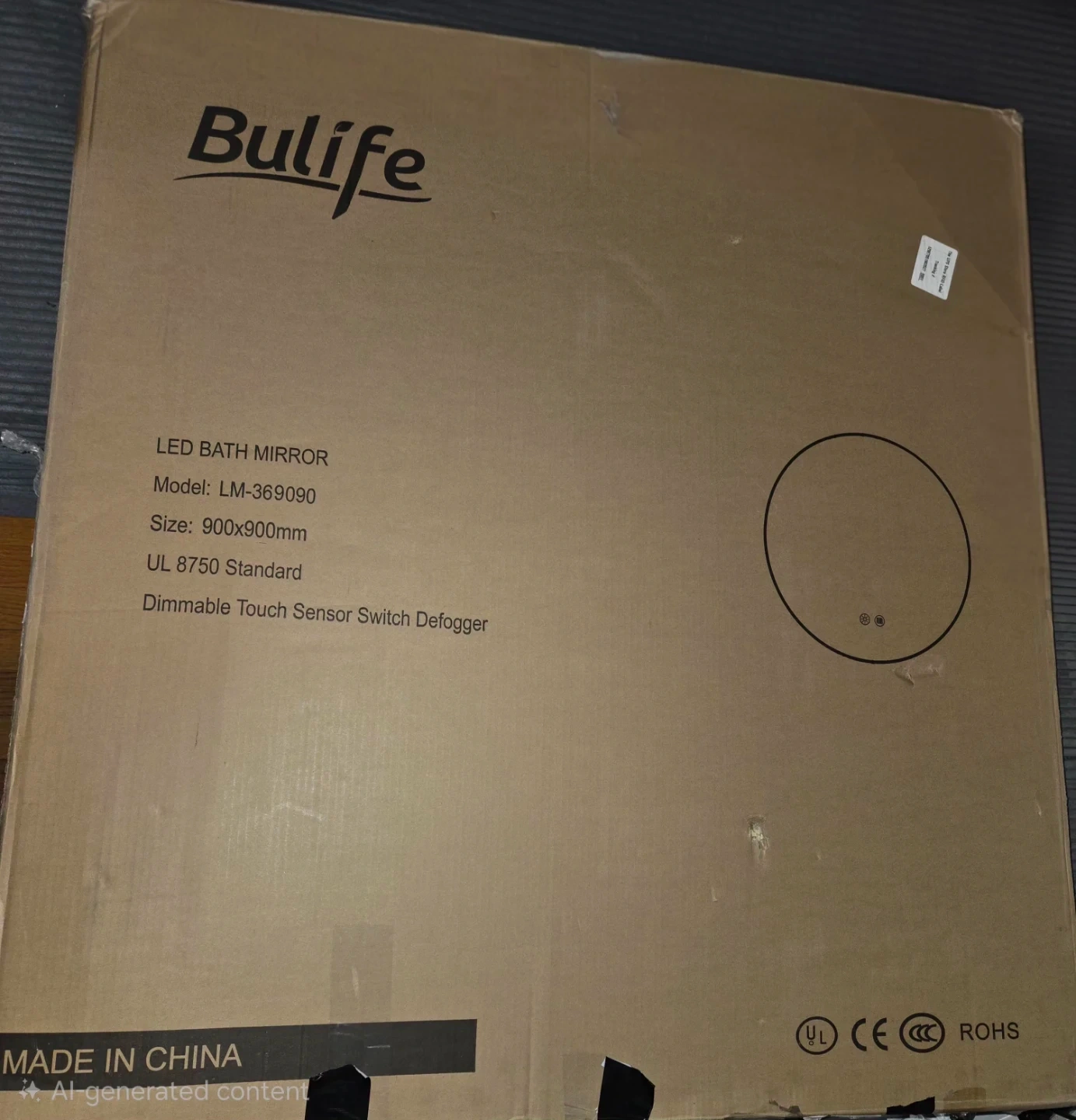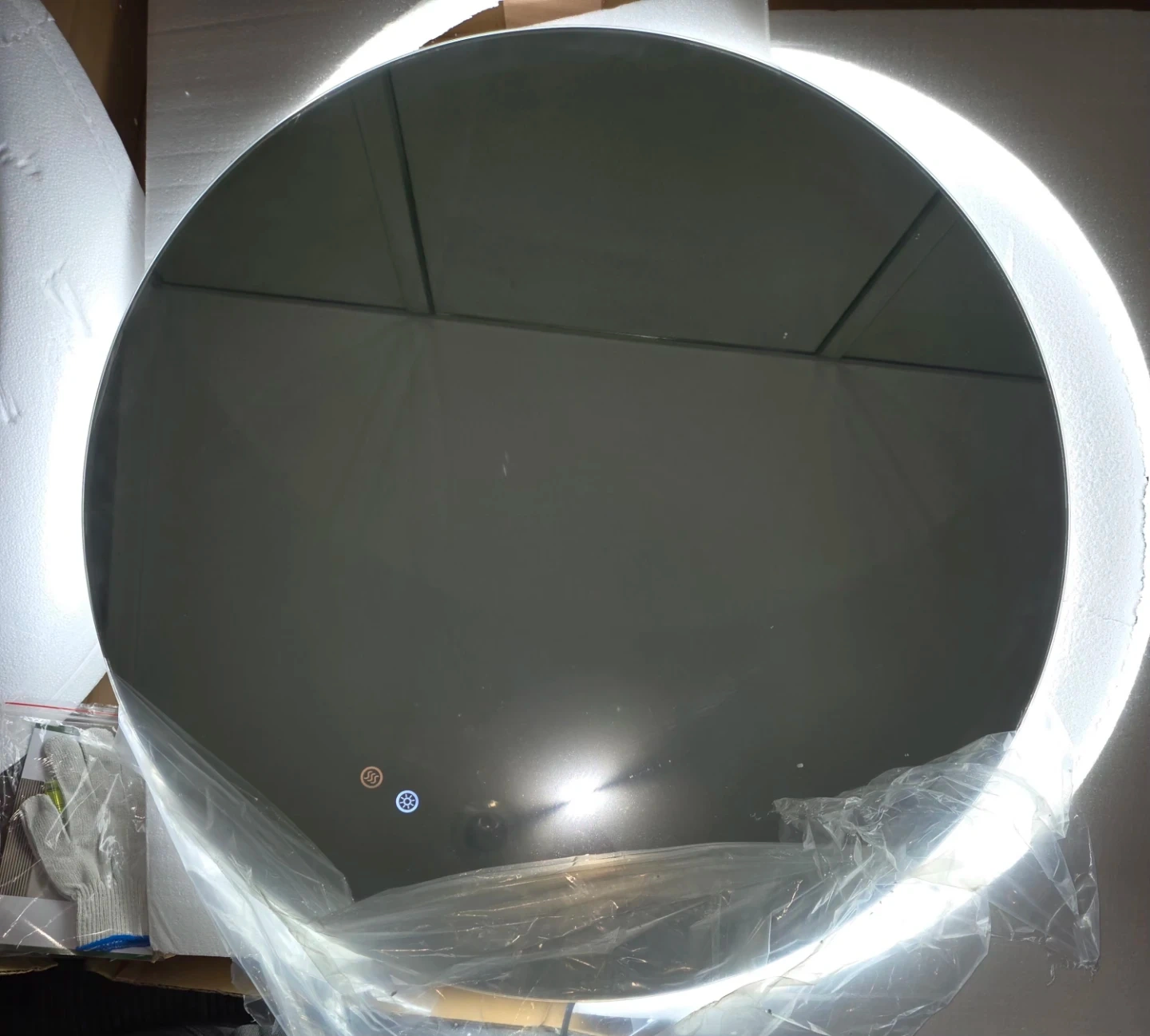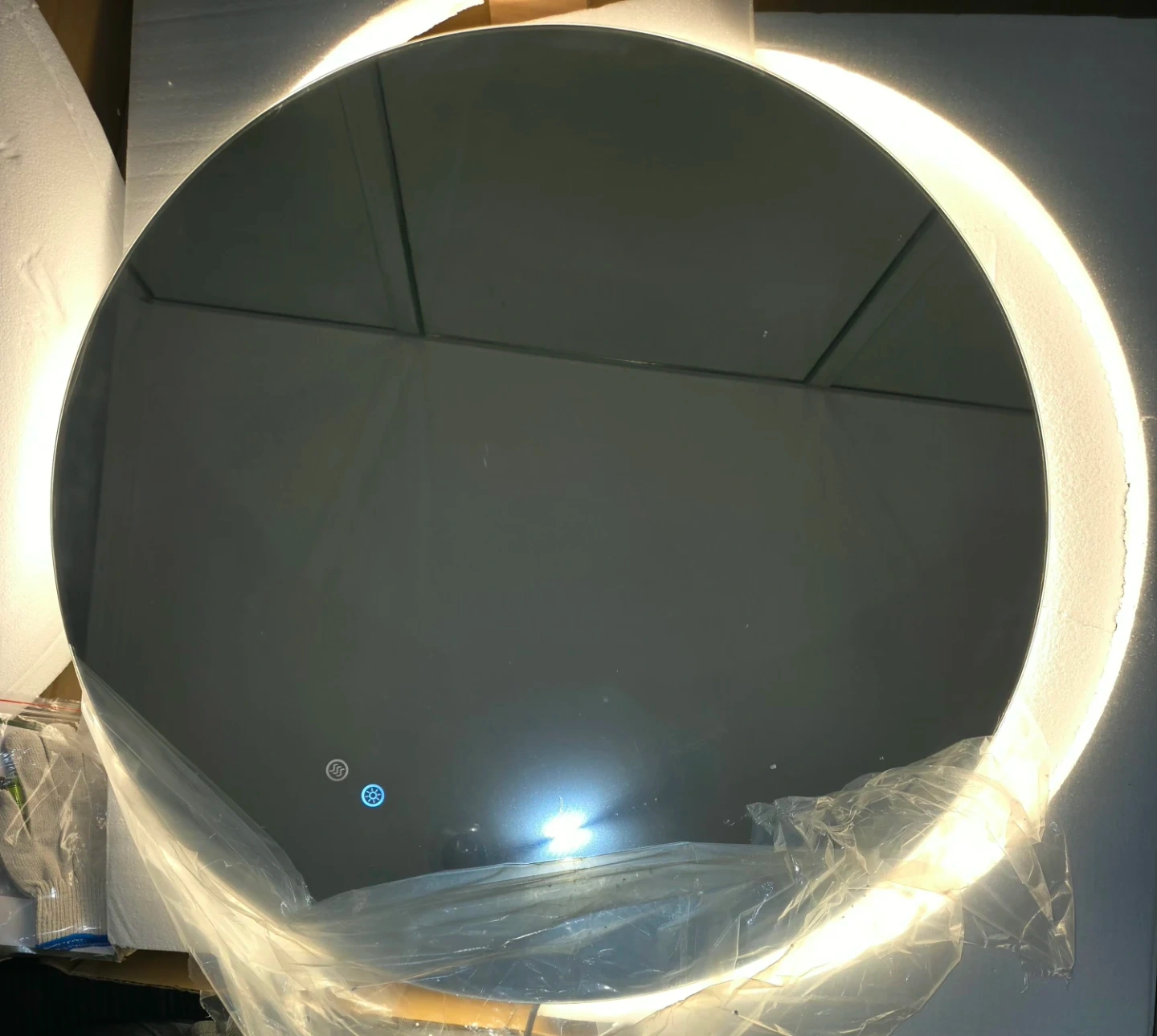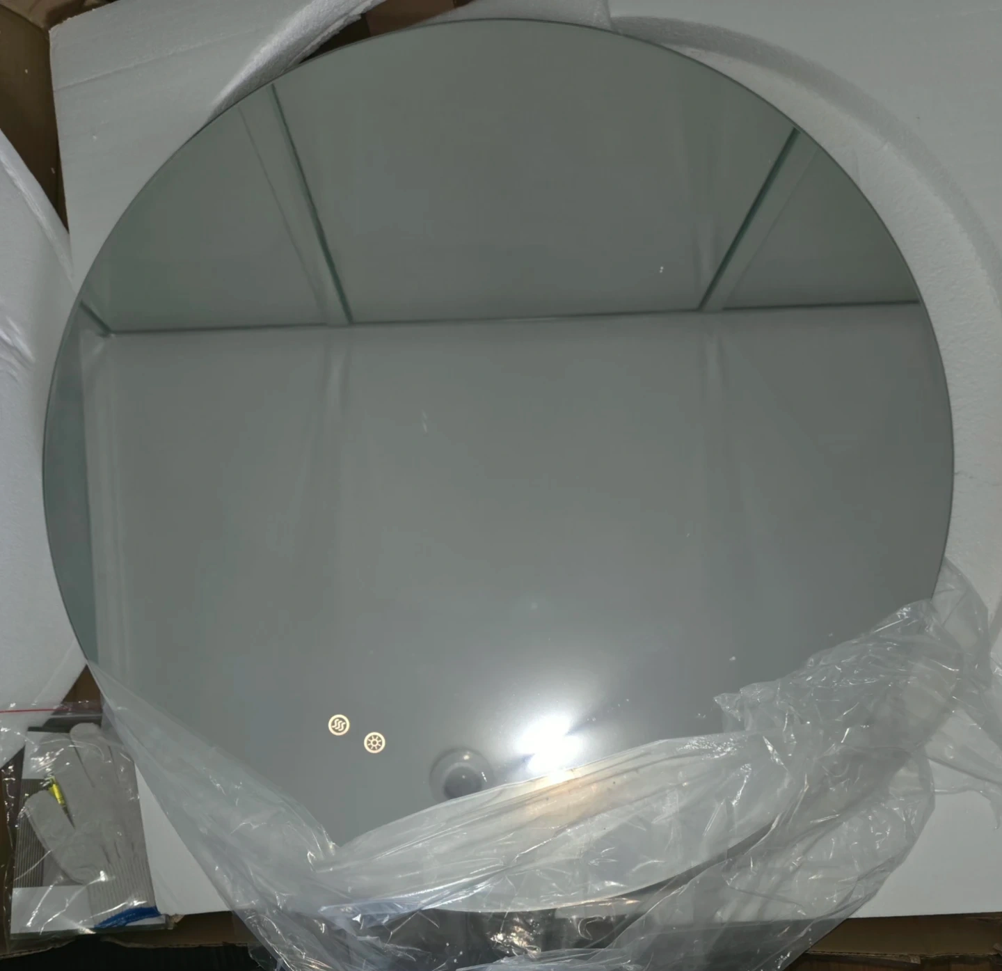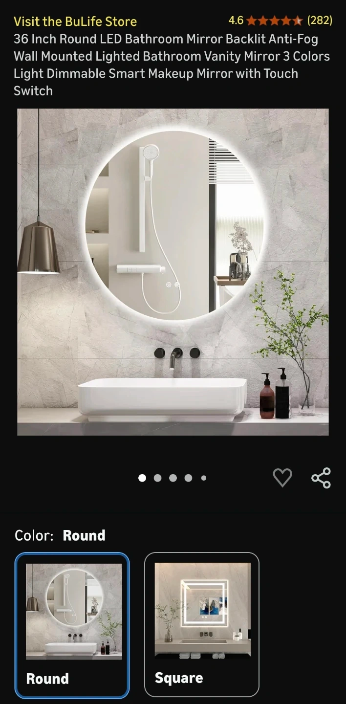 This round bathroom mirror features a built-in LED light with adjustable color temperature. It has a defogging function for clear visibility. Dimensions are 36 inches in diameter.