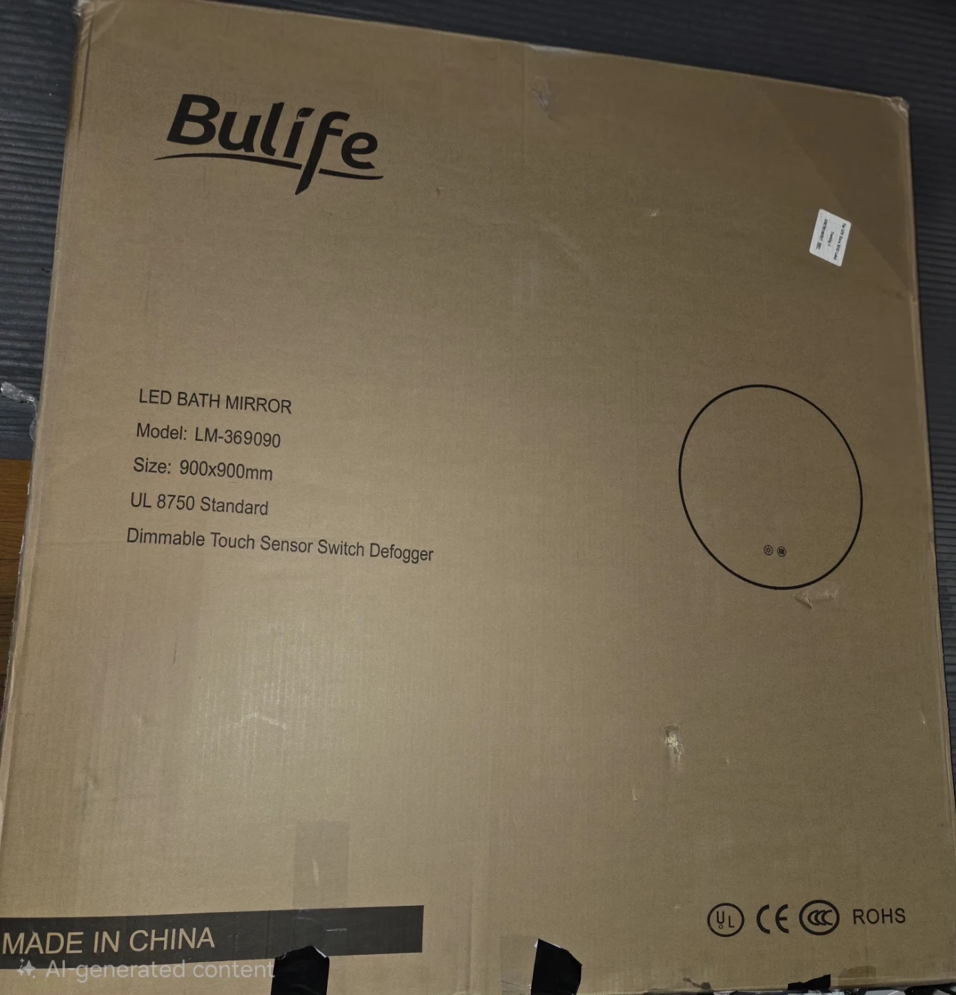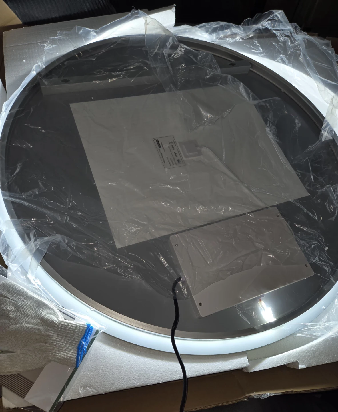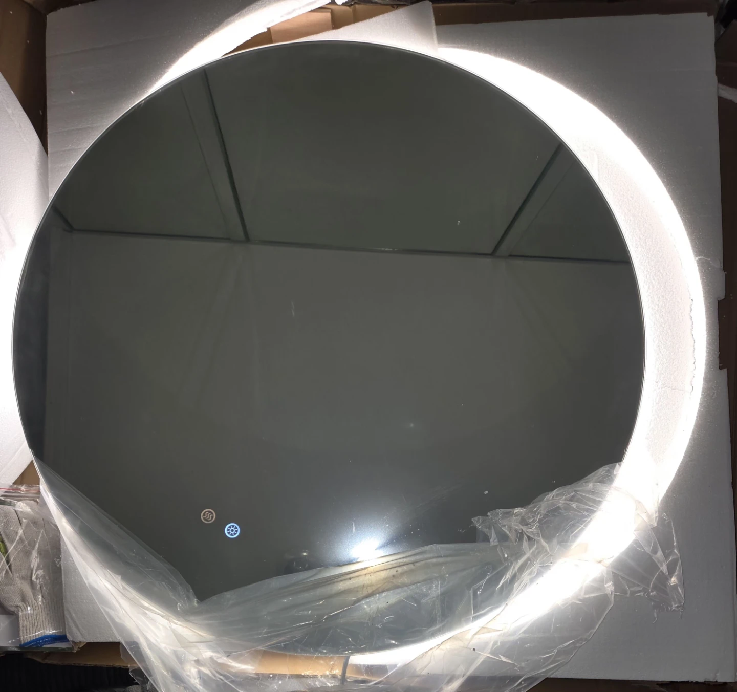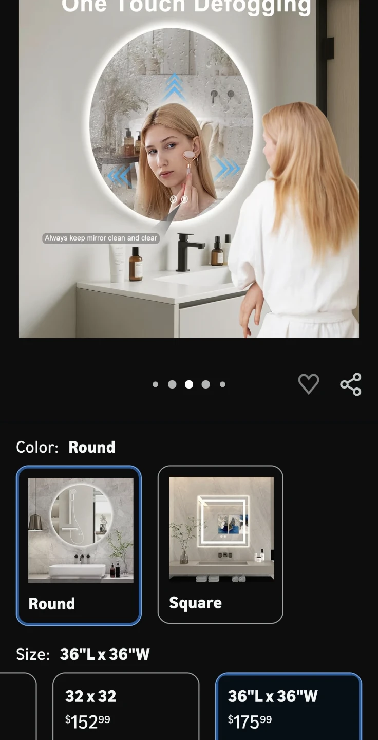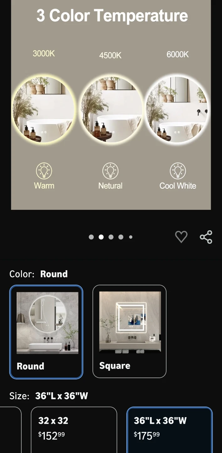 This round bathroom mirror features a built-in LED light with adjustable color temperature. It has a defogging function for clear visibility. Dimensions are 36 inches in diameter.