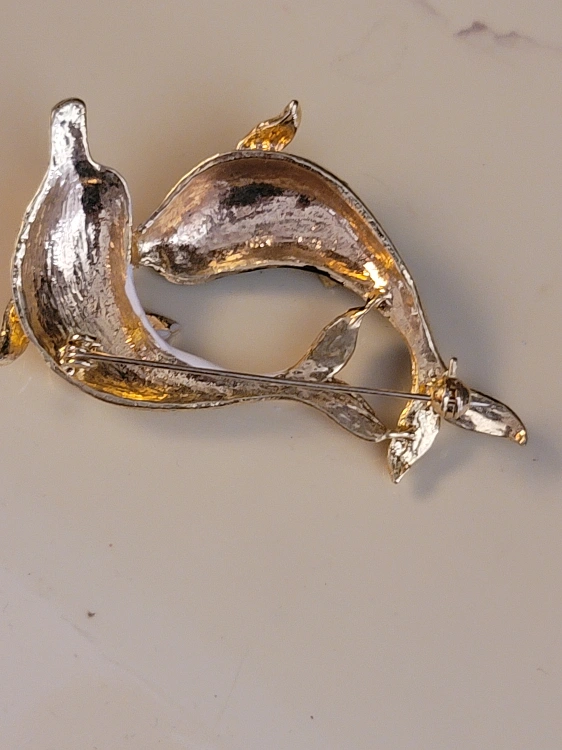 18Adorable vintage brooch pin. Features two dolphins, one black and one white enamel. Gold tone metal. Great addition to any collection. cash and pick up only