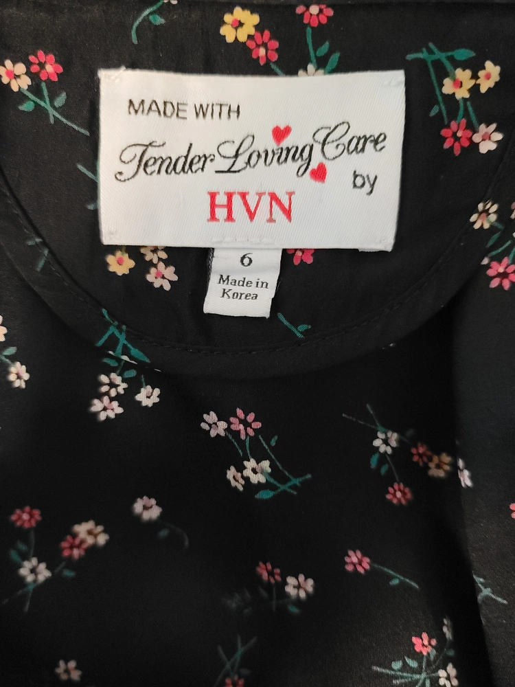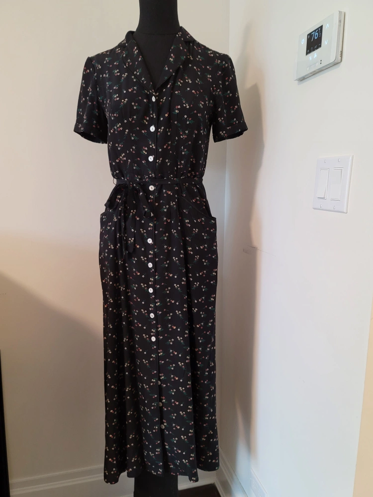 Adorable black midi dress. Features short sleeves, button-front closure, pockets, and a tie waist. Made with Tender Loving Care.