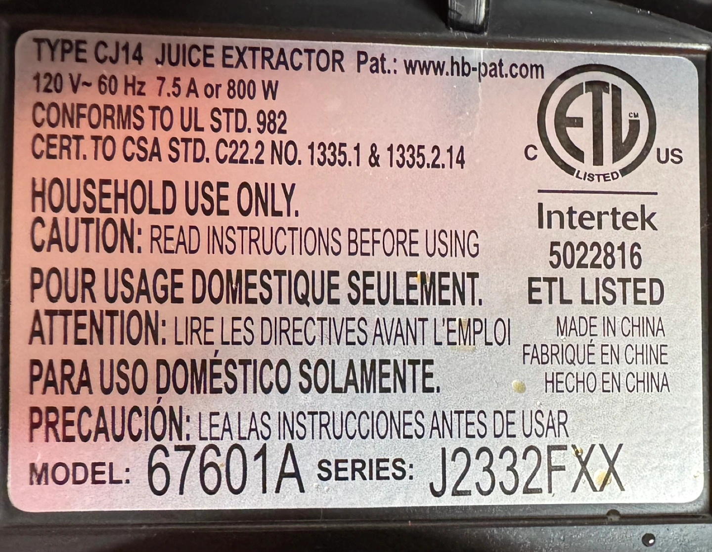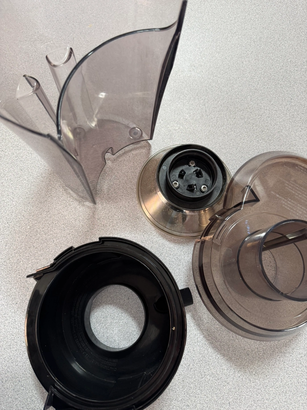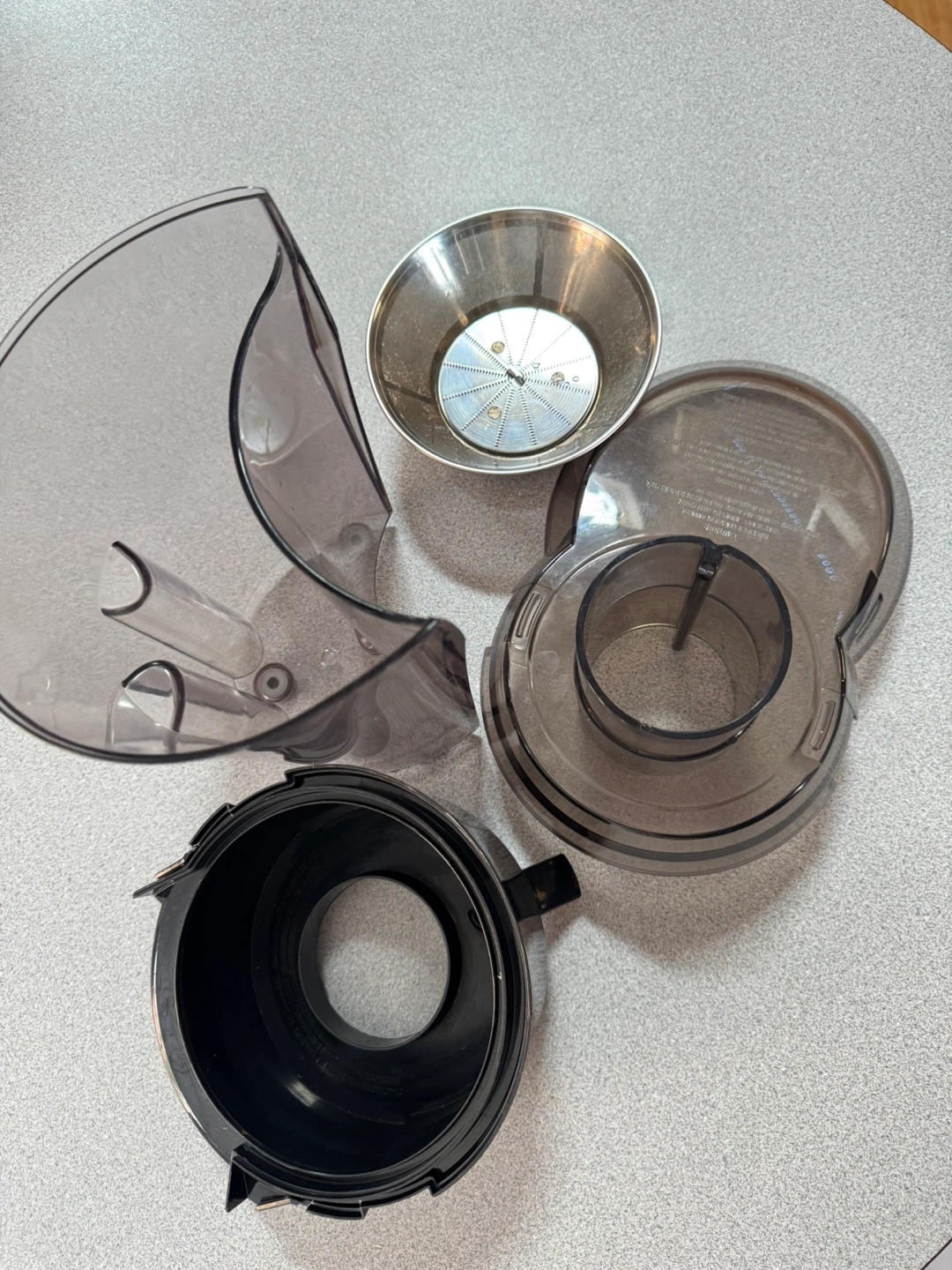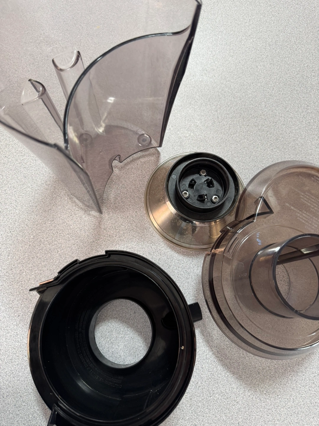 163Various parts from a Hamilton Beach juice extractor. Includes the main housing, lids, and filter. Used, some minor wear.