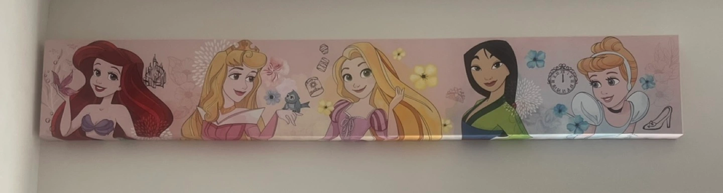 158Beautiful Disney Princesses wall art. Features Ariel, Aurora, Rapunzel, Mulan, and Cinderella. Pastel colors. Perfect for a child's room.