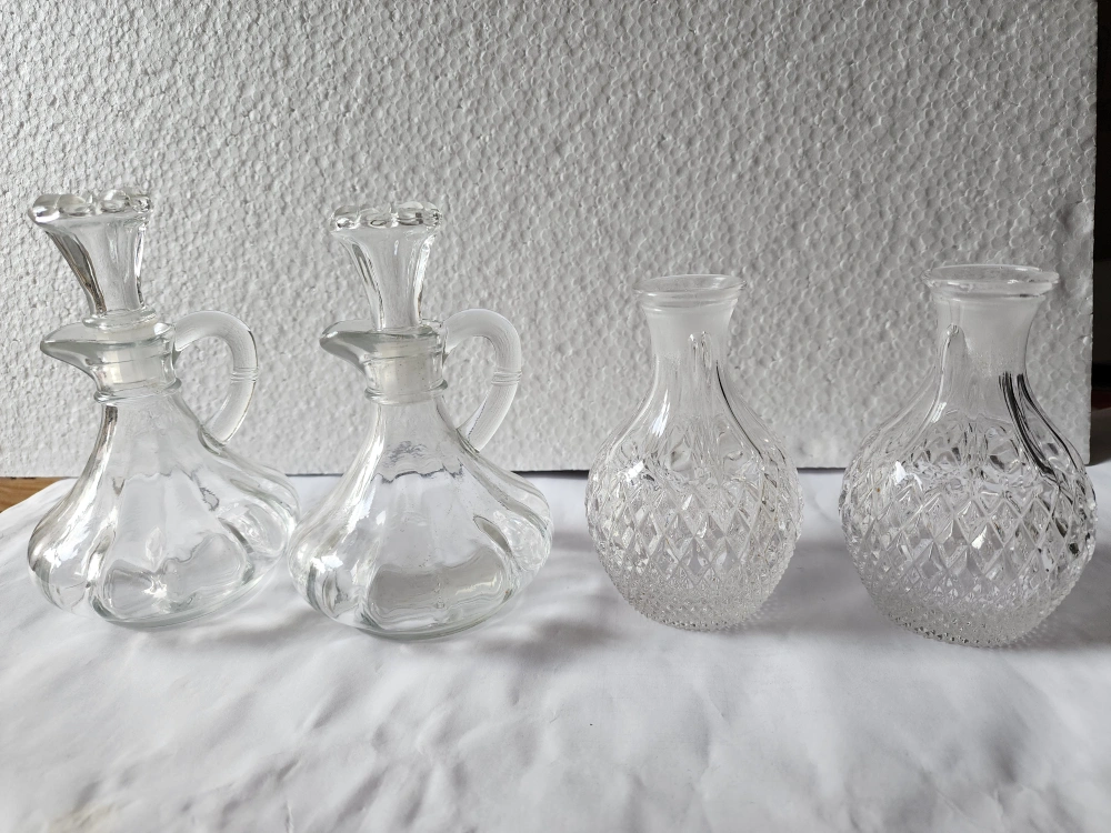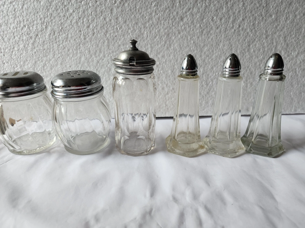97Set of vintage glass spice and condiment containers. Includes salt and pepper shakers, sugar bowl, and oil and vinegar cruets. Clear glass with various styles and designs. Perfect for adding a touch of vintage charm to your kitchen. $8 /pair BUYER HAS TO PICK UP CASH ONLY
