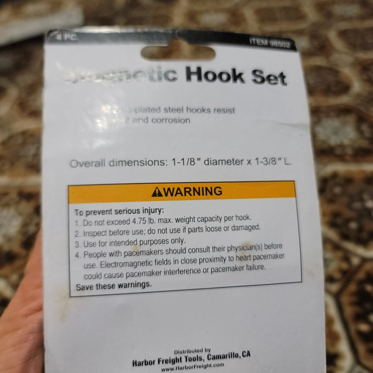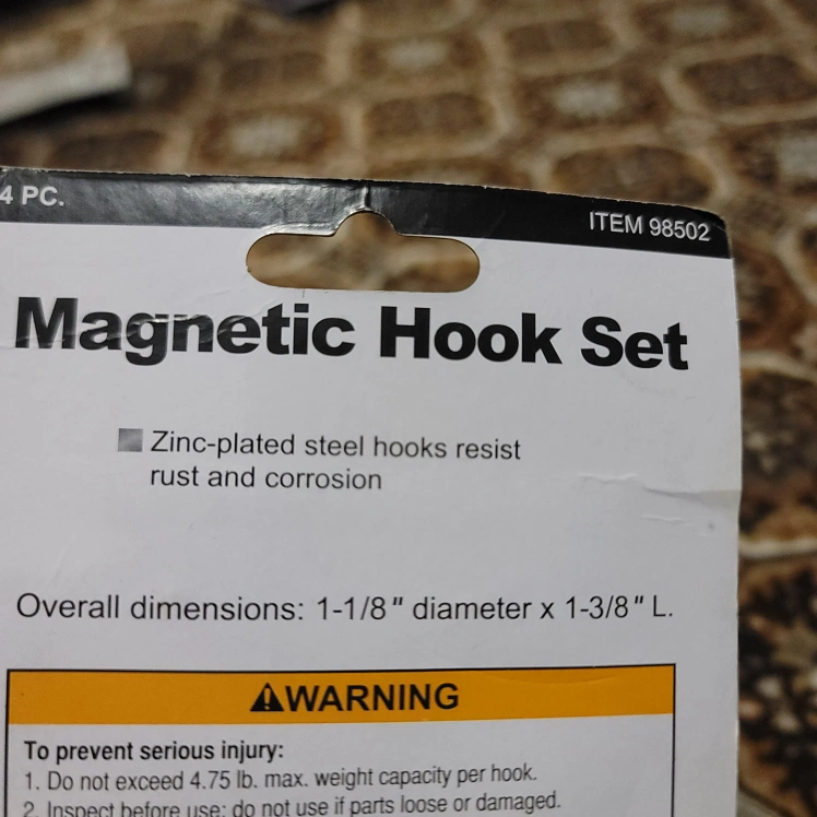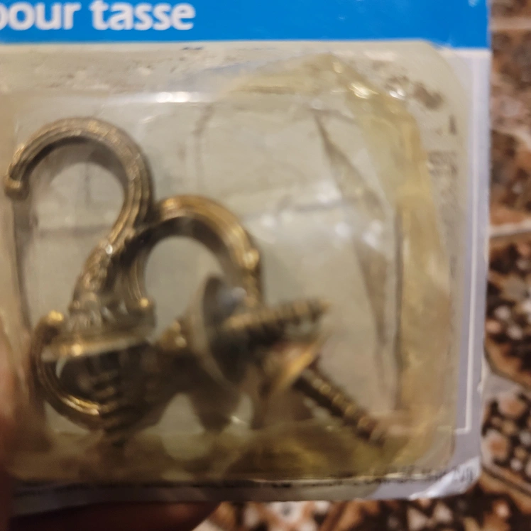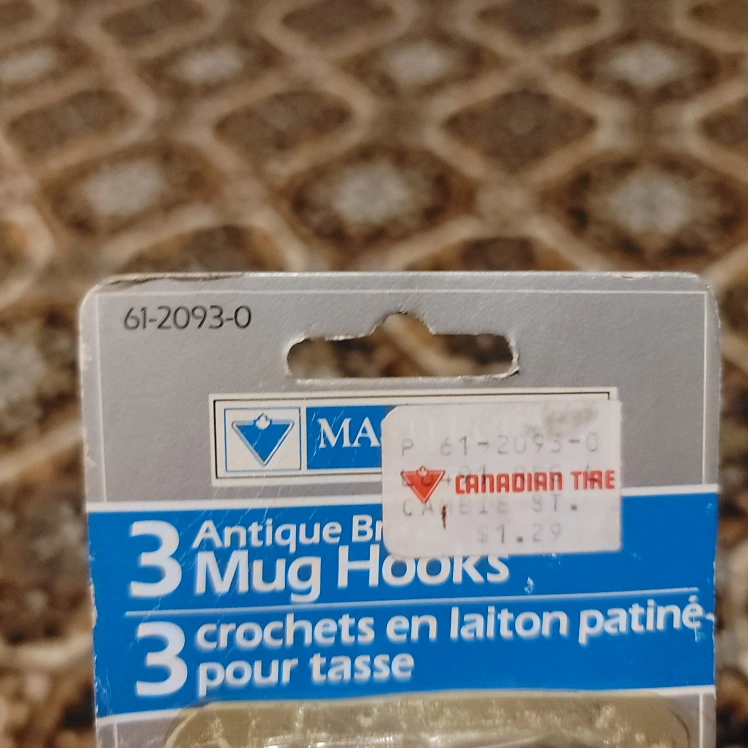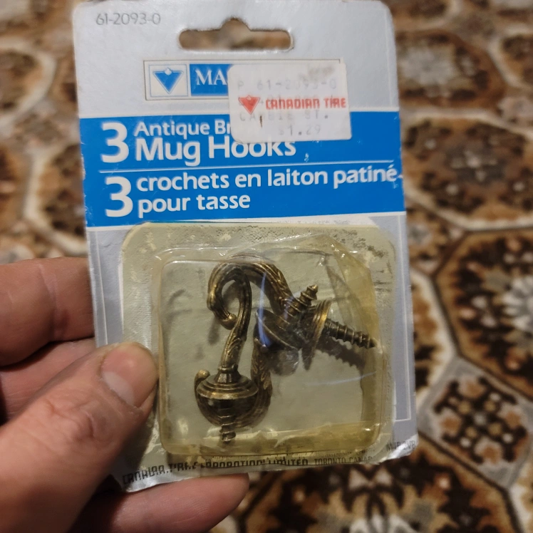 Three antique brass mug hooks. Patinated finish. Includes screws. Sold in original packaging. Also included is a 4-piece magnetic hook set. Zinc-plated steel hooks. Resist rust and corrosion. let's give it a new home!