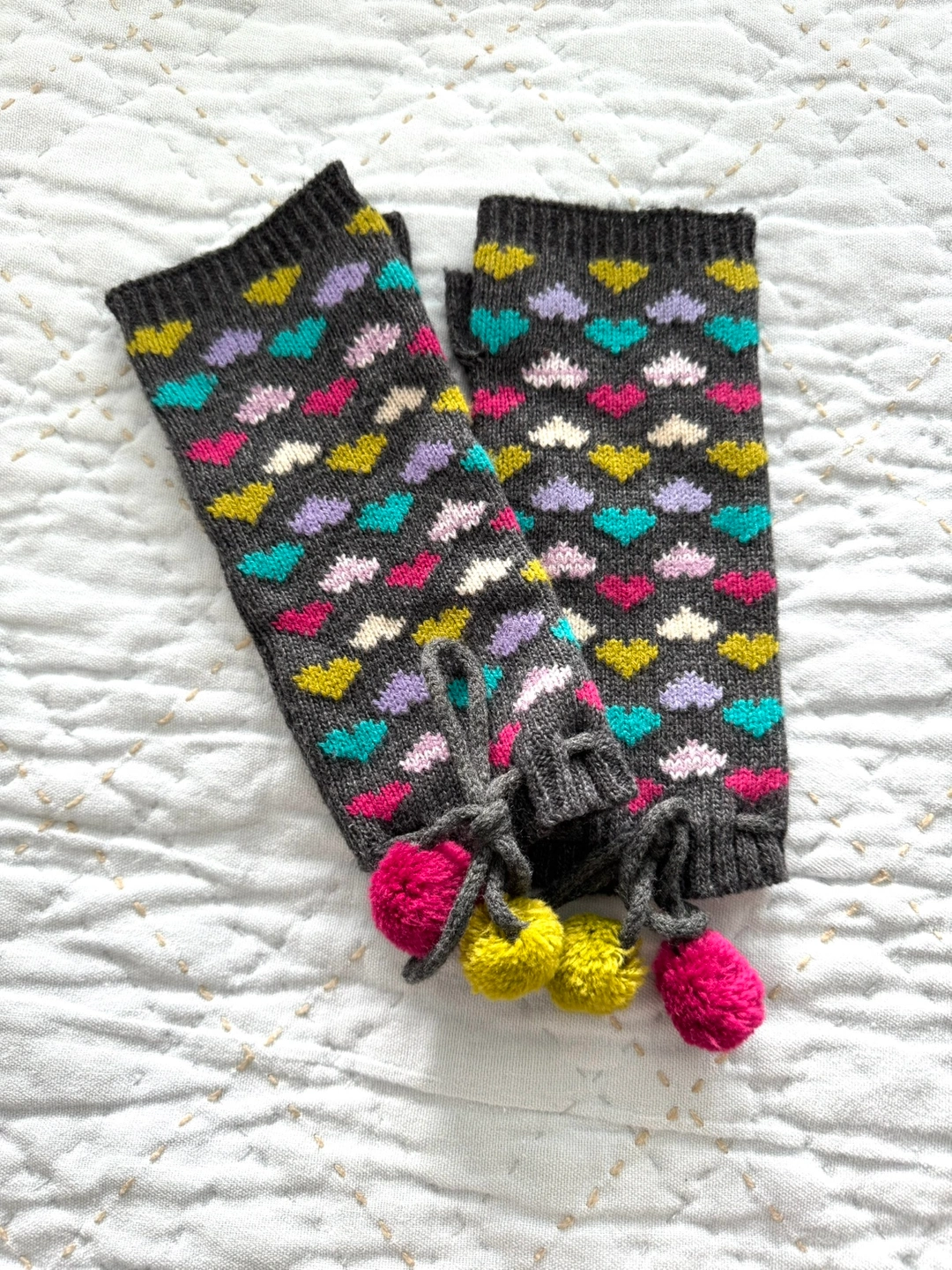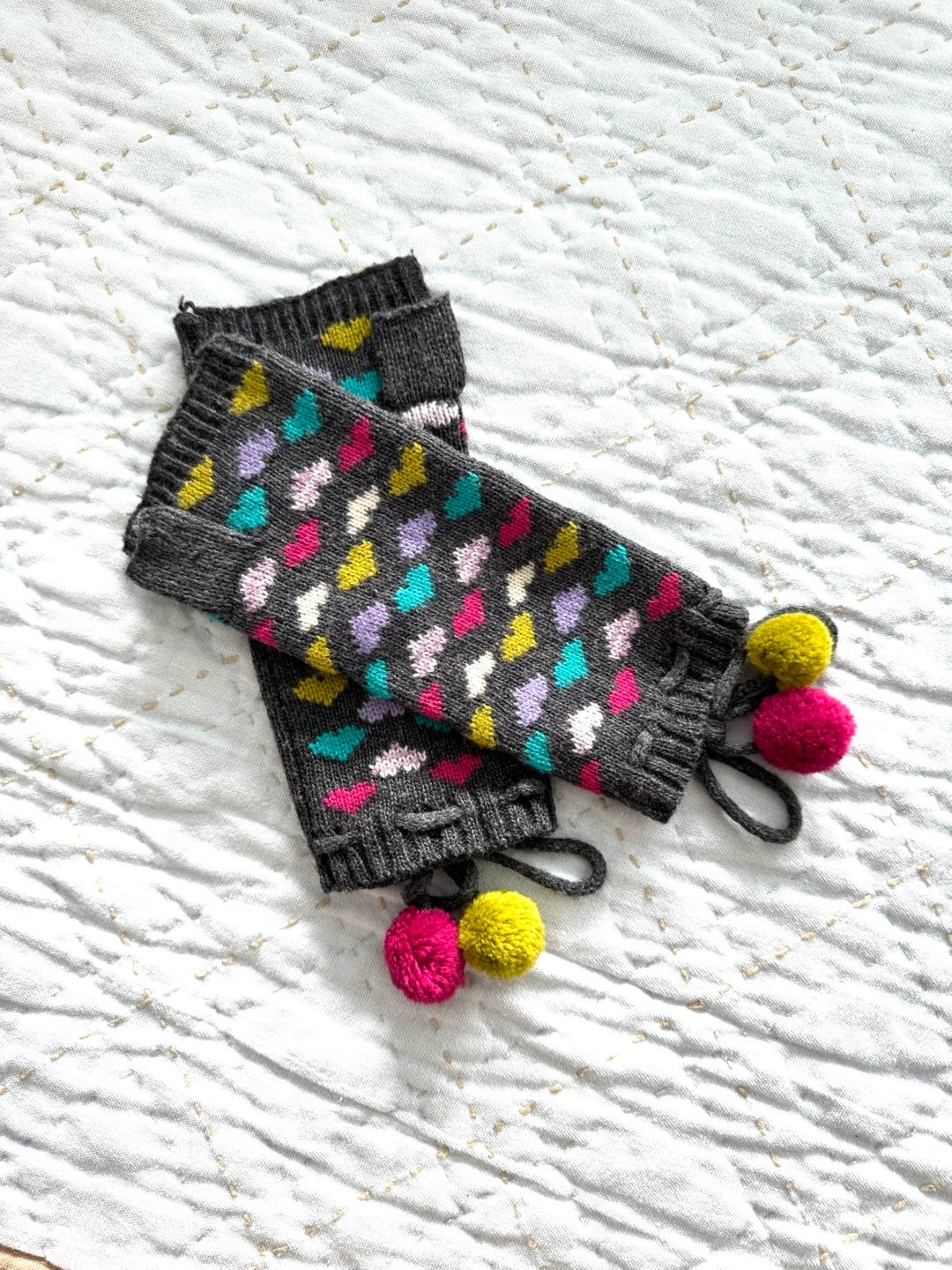 273NEW Cozy fingerless gloves. Grey knit with colorful hearts. Very Cute Pom-pom accents. Perfect for fall, winter and spring! —- Cash only. Pick Up only.