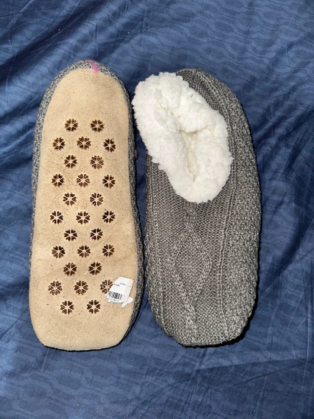 1000+Gray cable knit slippers. Fleece-lined interior. Non-slip soles.