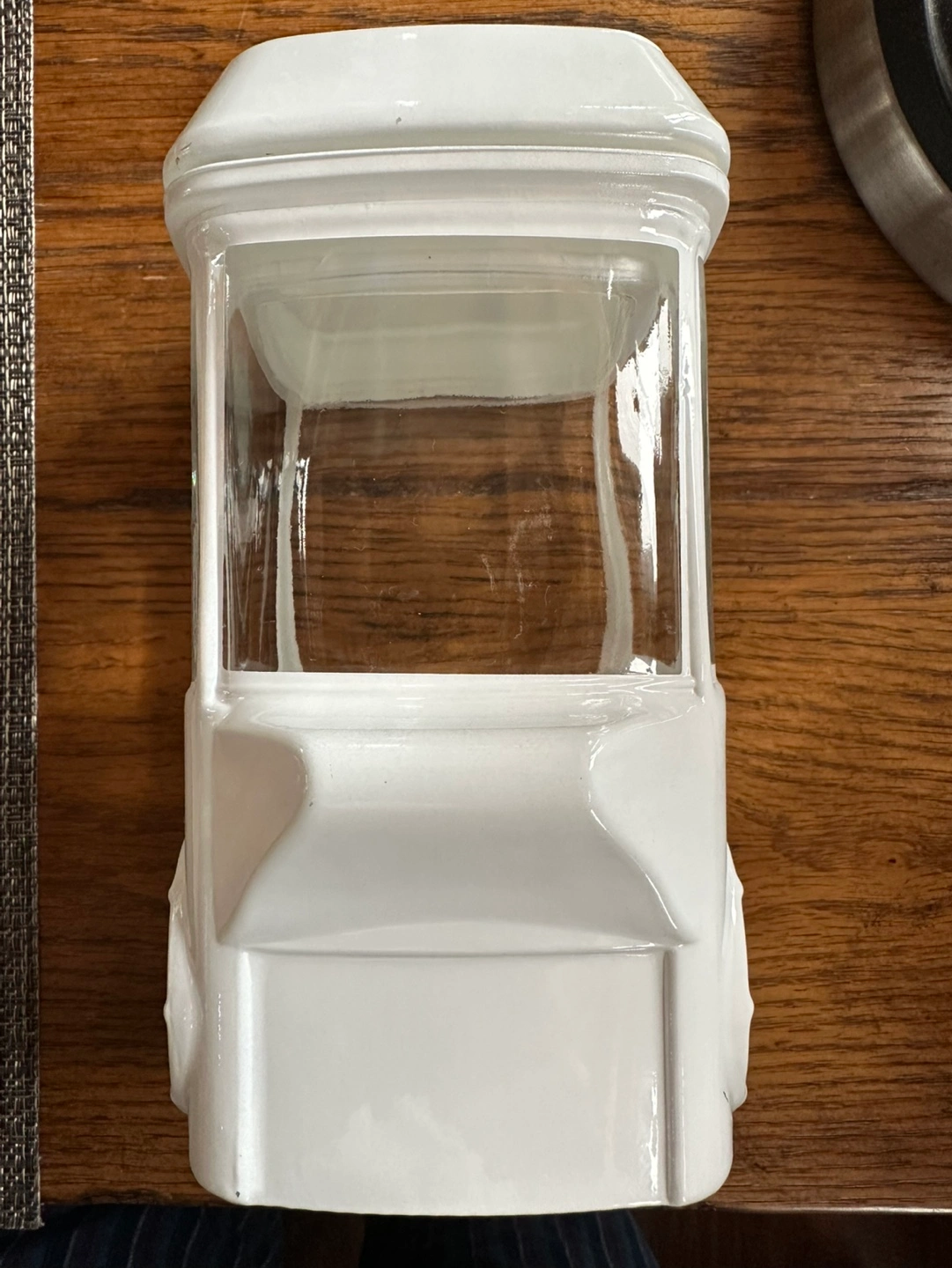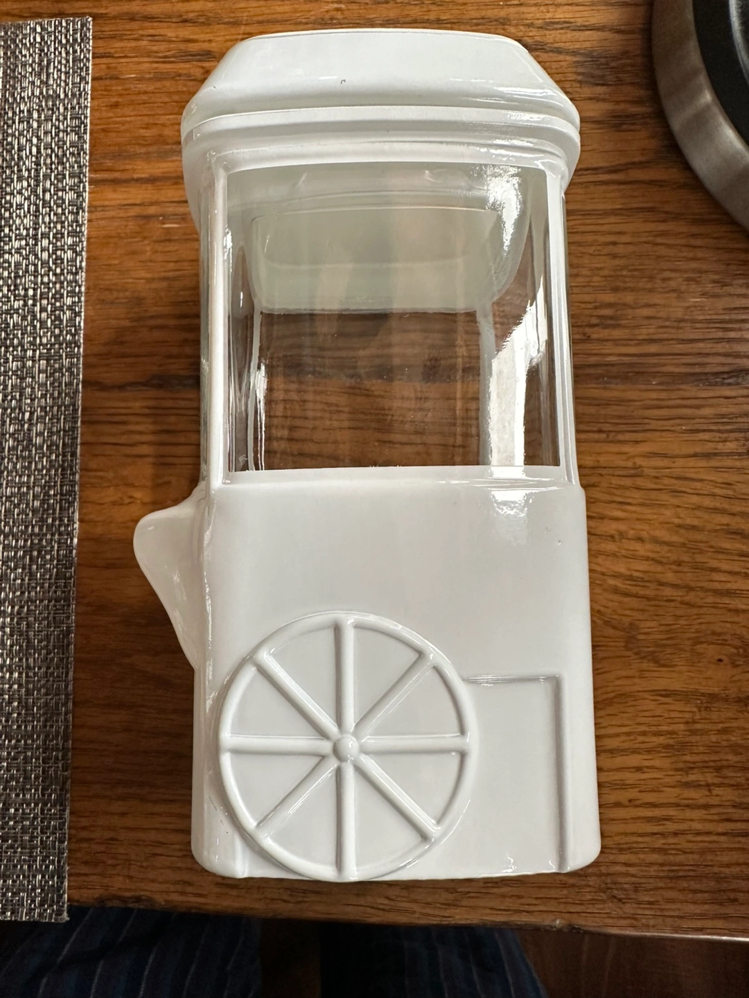 29Adorable white ceramic container. Shaped like a small food cart. Clear glass front. Perfect for storing snacks or treats. Gently used.