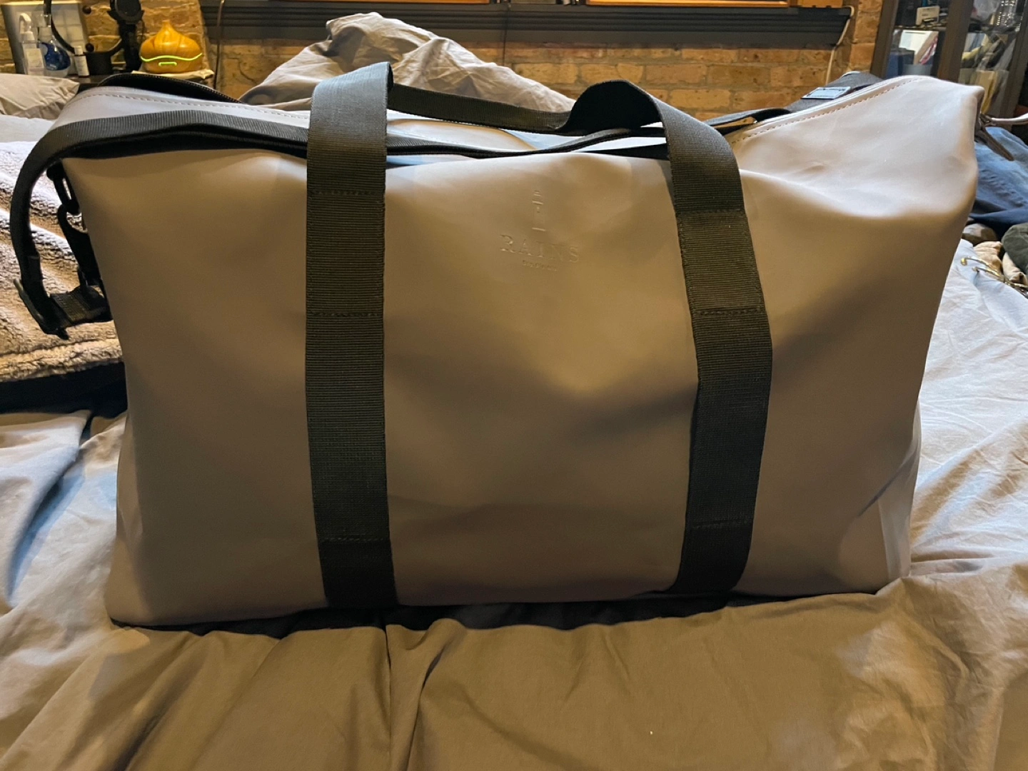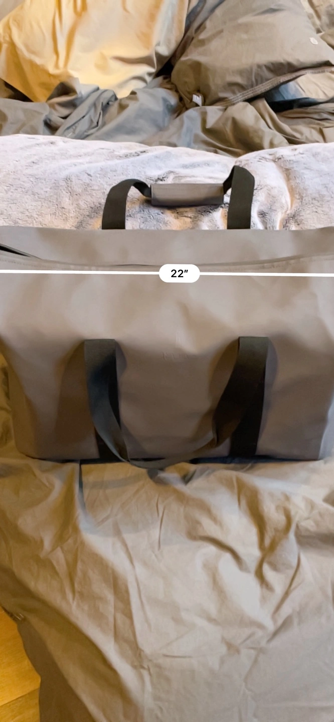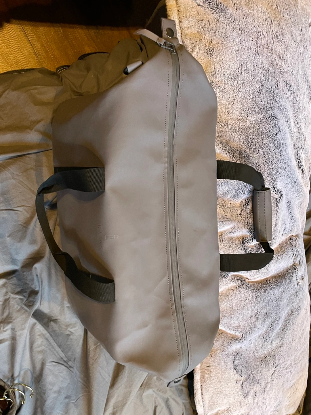 29Large grey waterproof duffel bag. Top handles and a long shoulder strap. Spacious interior. Approximately 22" wide and 12" tall.