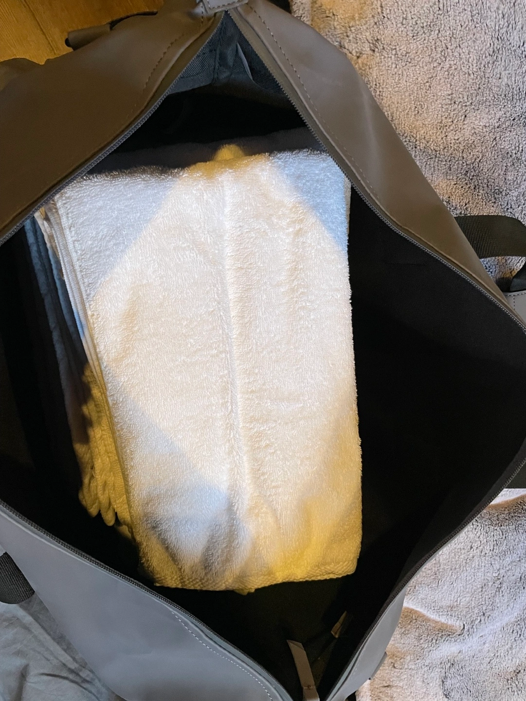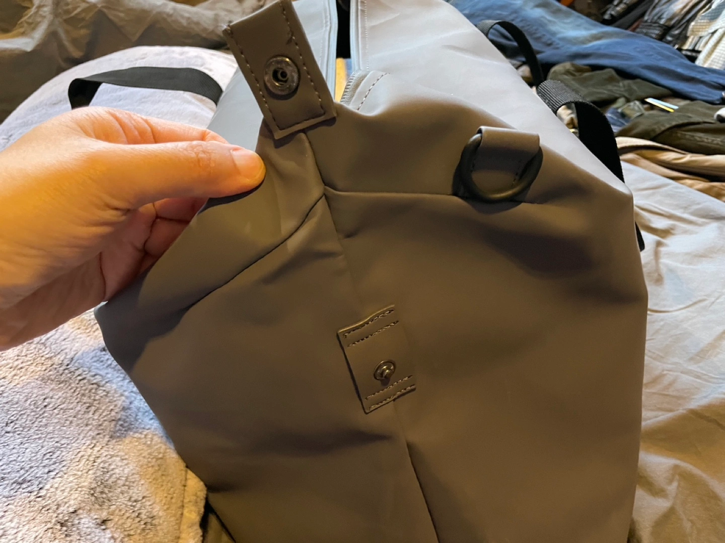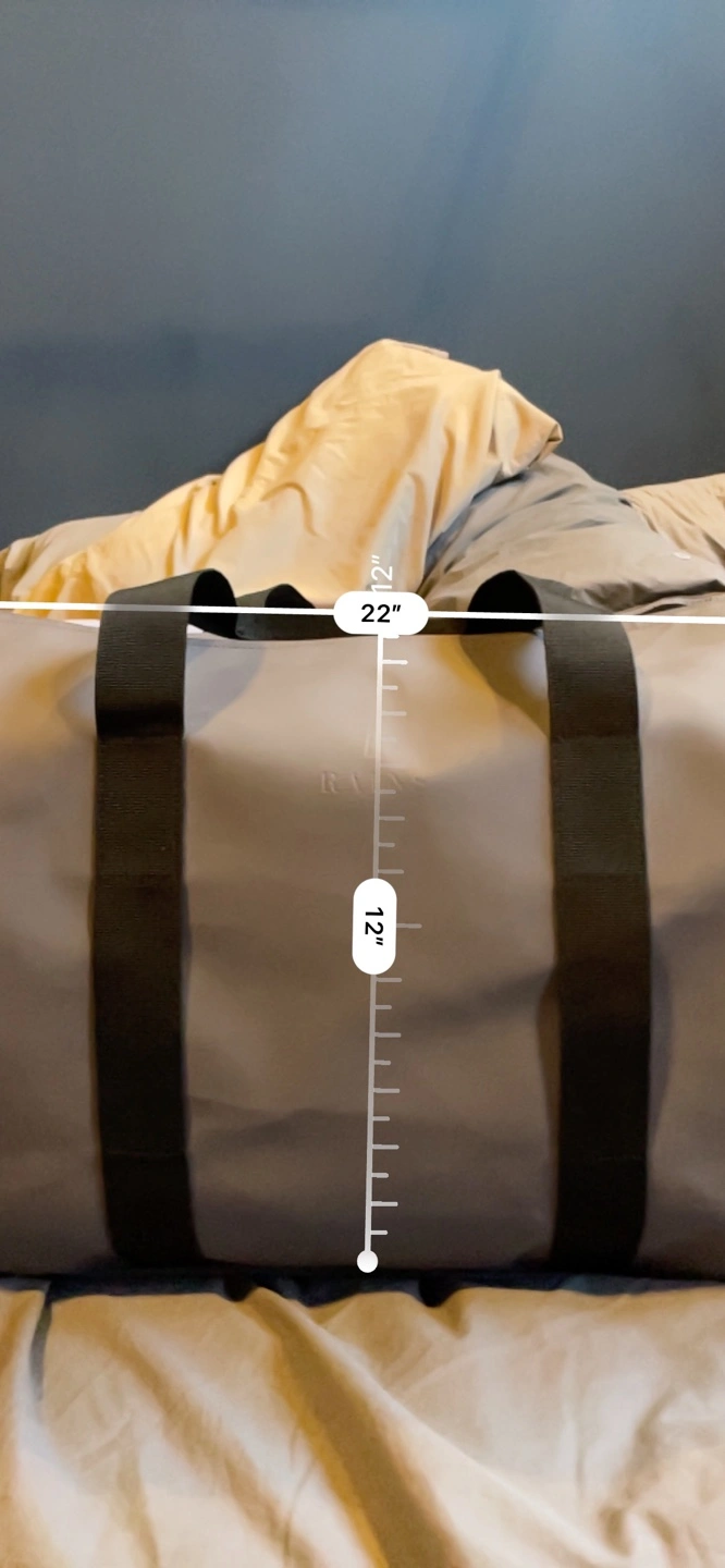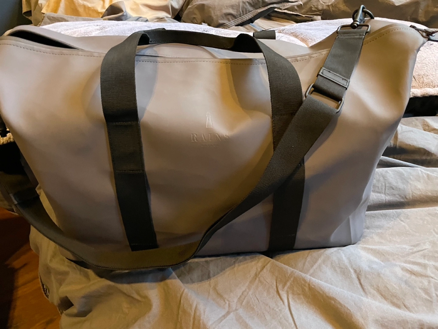 29Large grey waterproof duffel bag. Top handles and a long shoulder strap. Spacious interior. Approximately 22" wide and 12" tall.