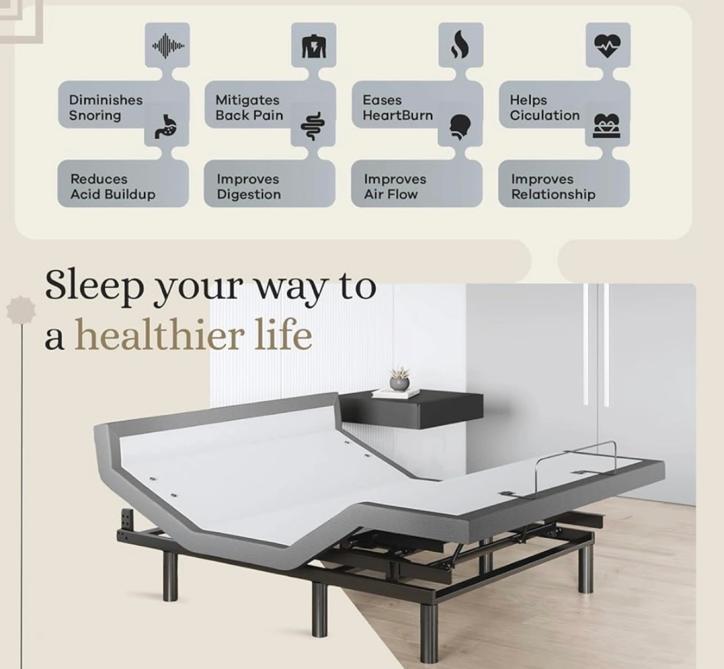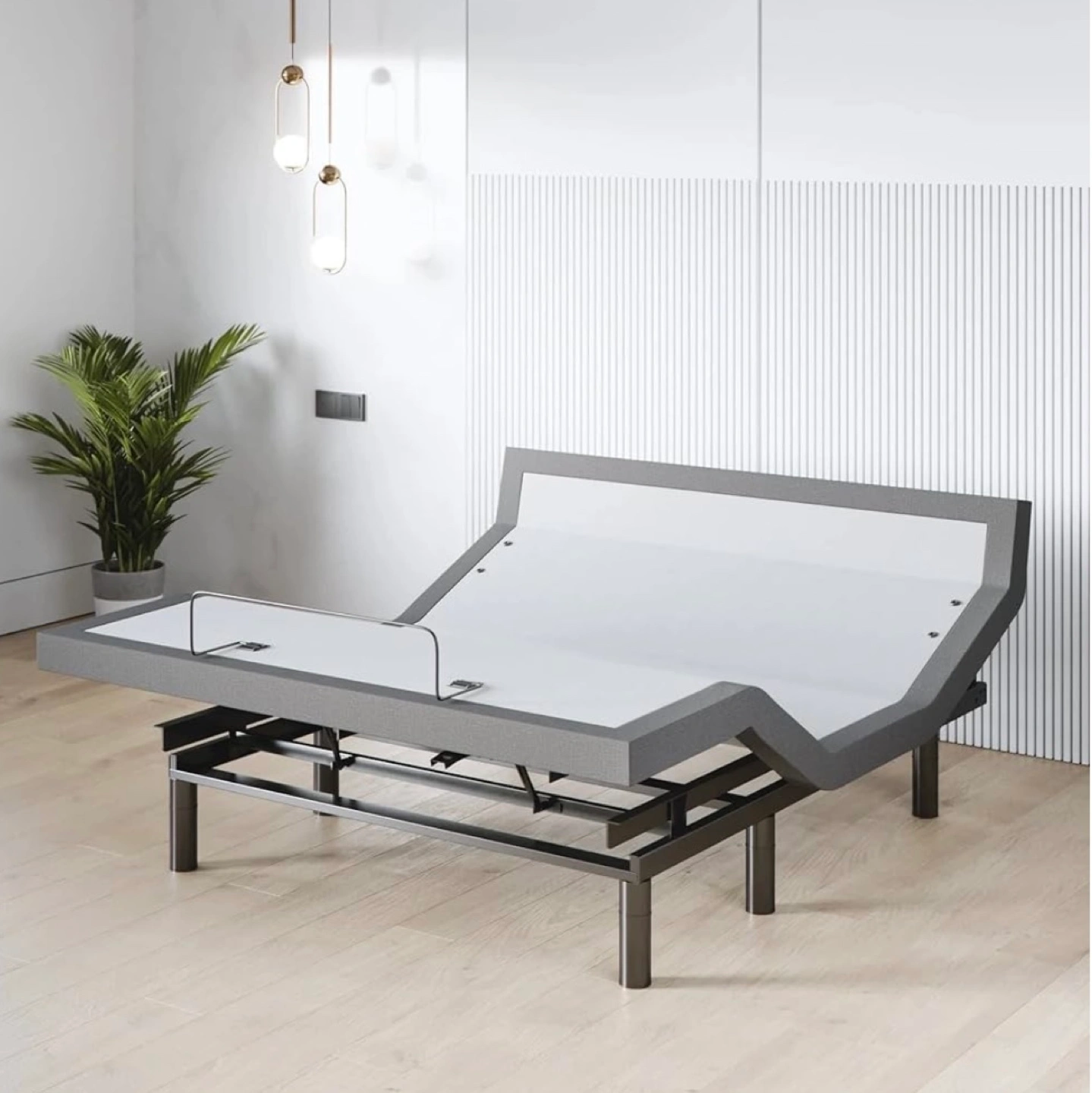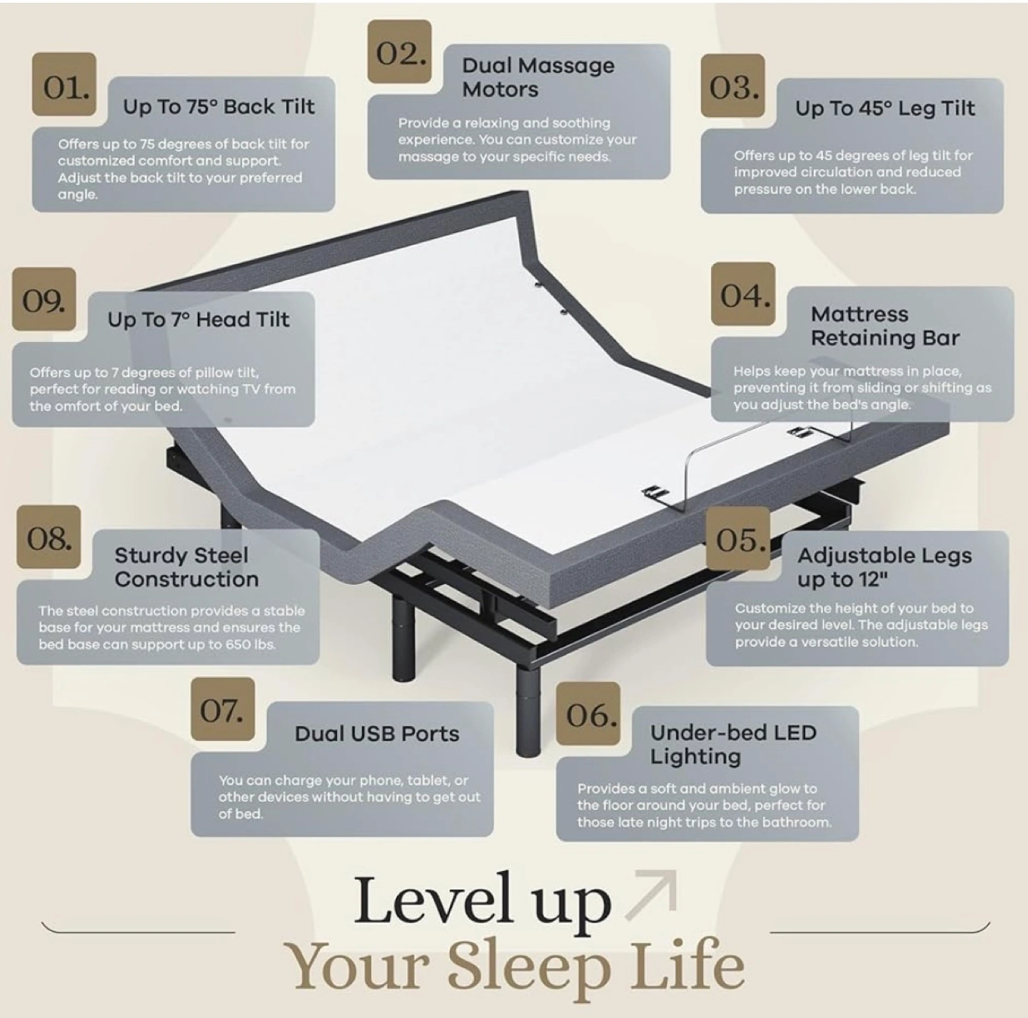 Adjustable base with remote. Features include massage, head and foot lift, zero gravity position, under-bed lighting. Sturdy steel construction. Supports up to 650 lbs. Dual USB ports. 7 degree head tilt, 75 degree back tilt, 45 degree leg tilt.