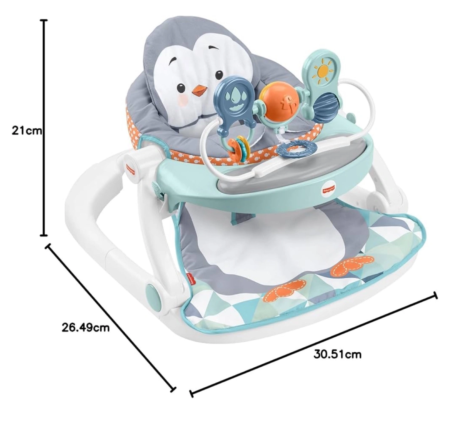 Adorable penguin-themed baby floor seat. Supports baby's sitting. Easy to fold for storage and travel. Machine-washable seat pad. Includes fun toys.