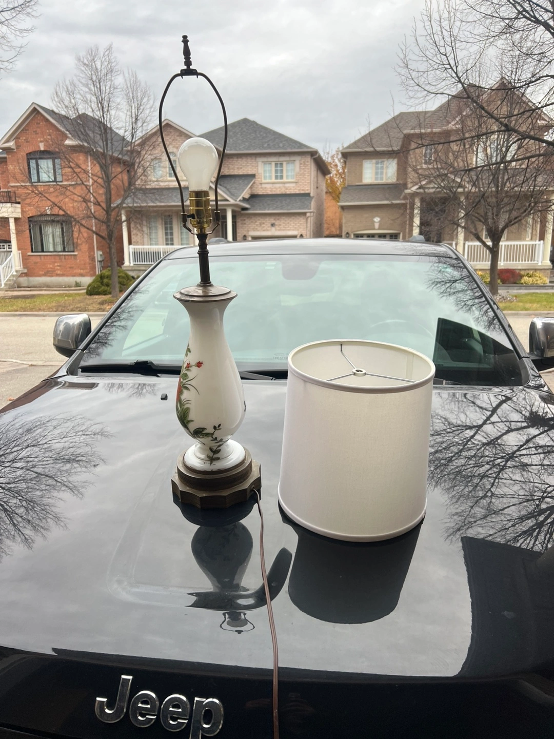 Beautiful vintage table lamp. Features a floral design on a white base. Includes a matching white lampshade. Great for a bedroom or living room.