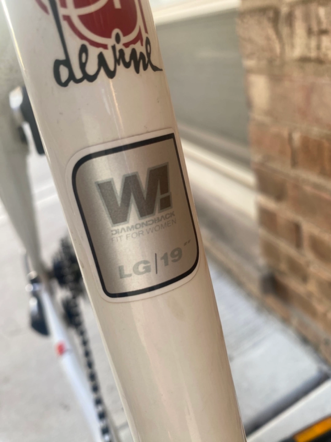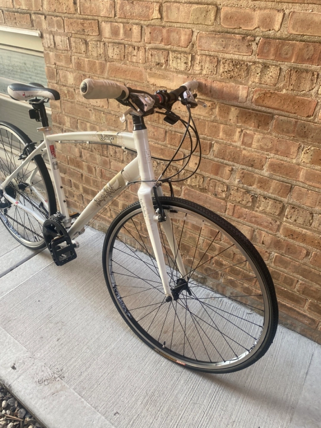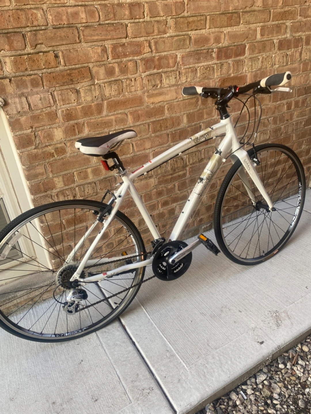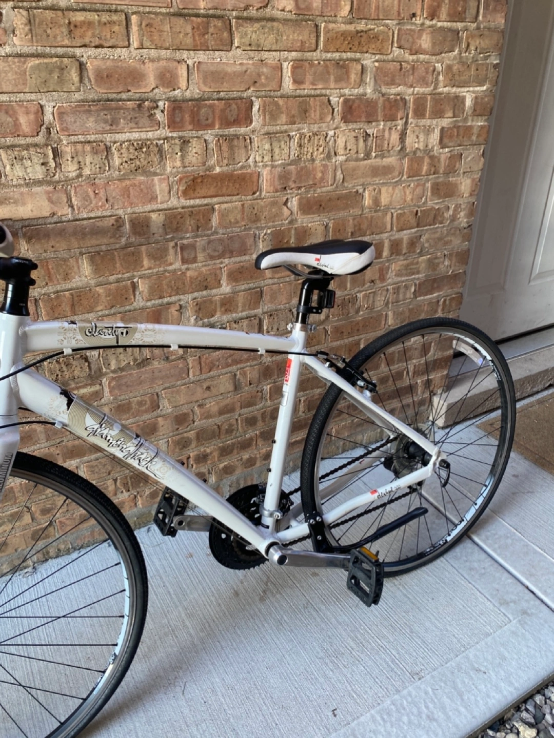 White Diamondback Devine hybrid bicycle. Size large, 19 inch frame. Good for women. Ready to ride.