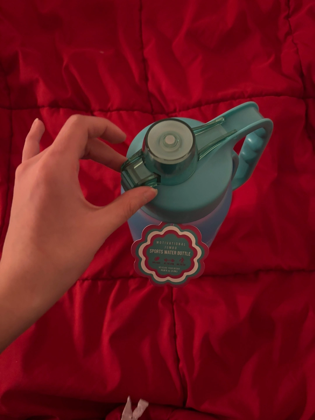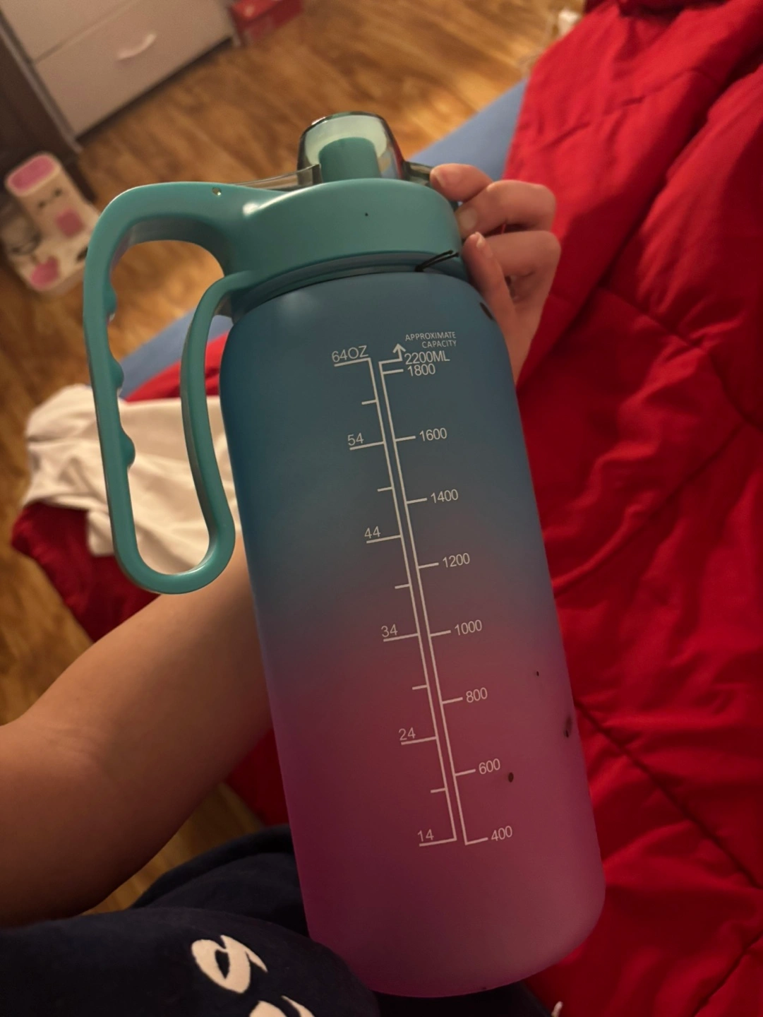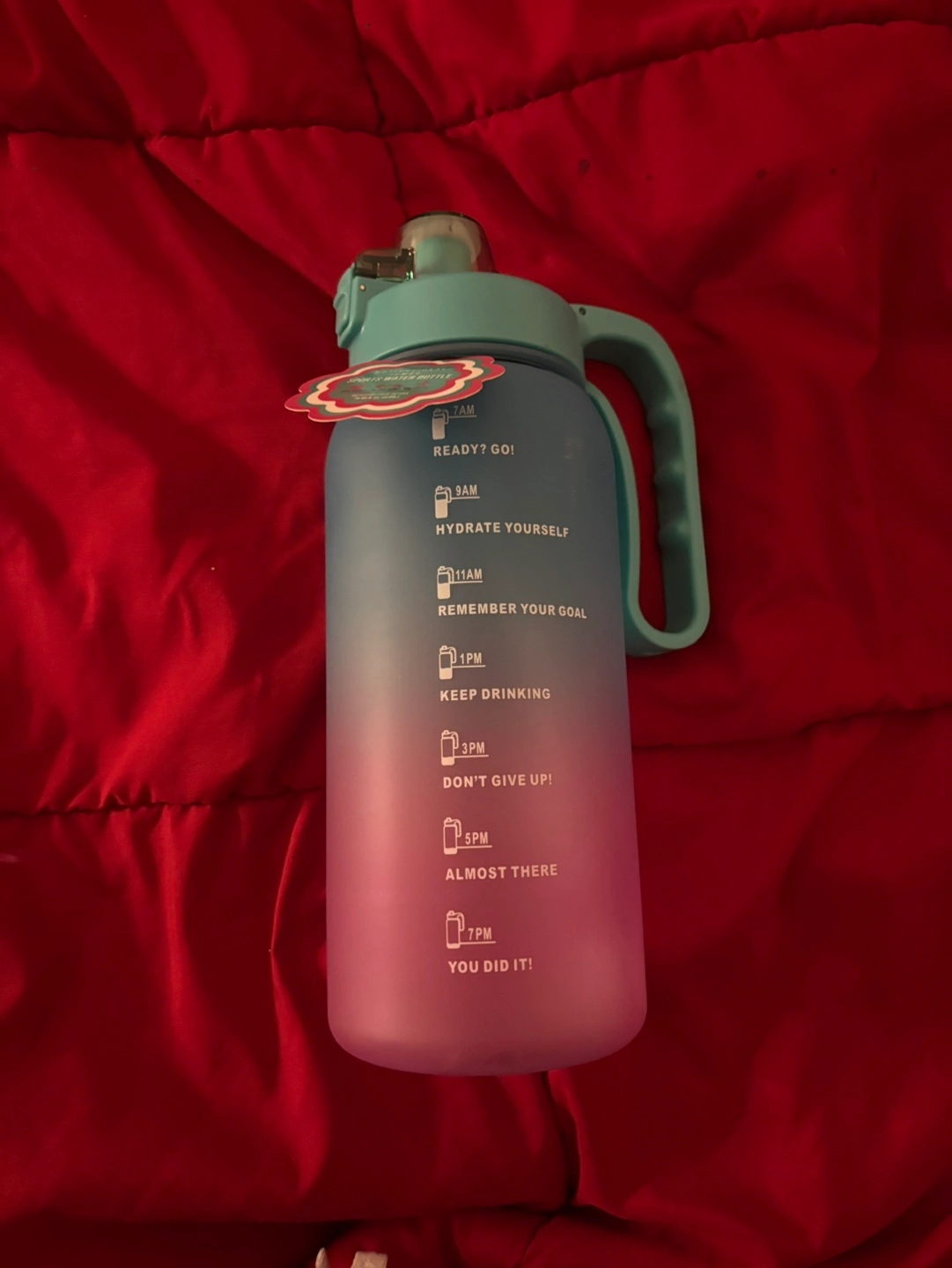 174Large capacity water bottle. Motivational quotes printed on bottle. Features a carrying handle and flip top lid. Great for staying hydrated throughout the day.