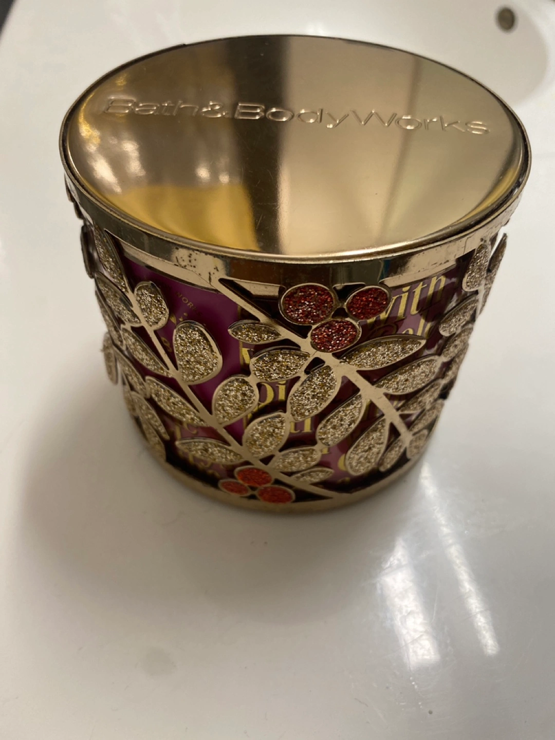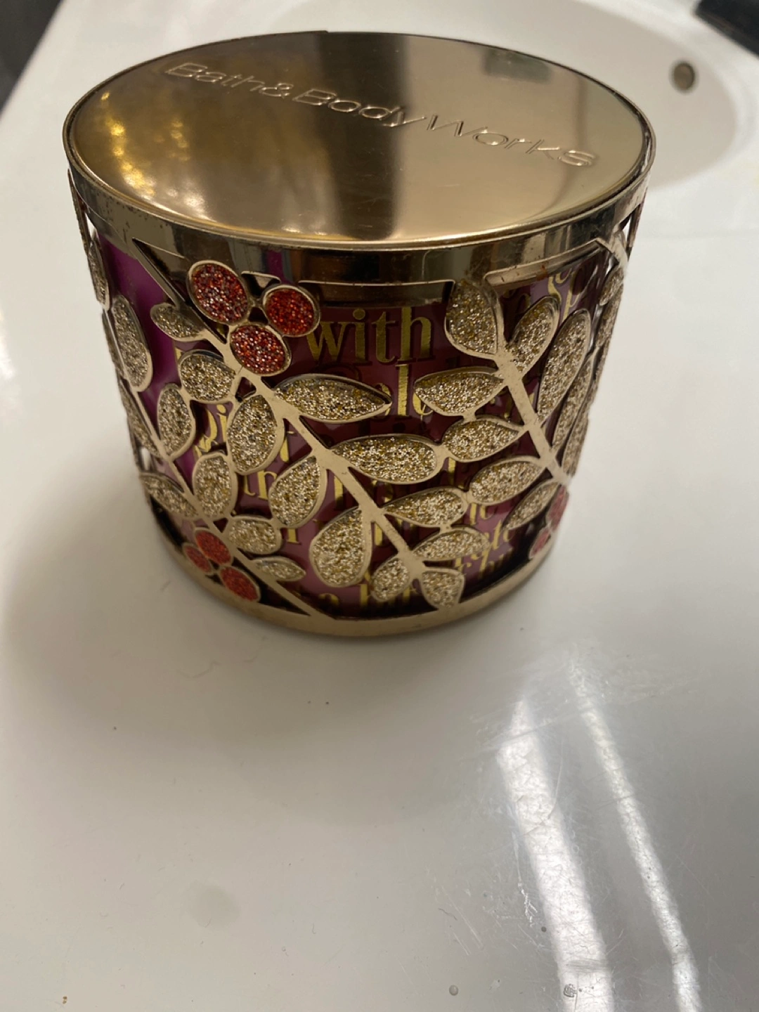 Gold and maroon candle holder. Glitter accents. Leaves and berries design. Perfect for holiday decor.