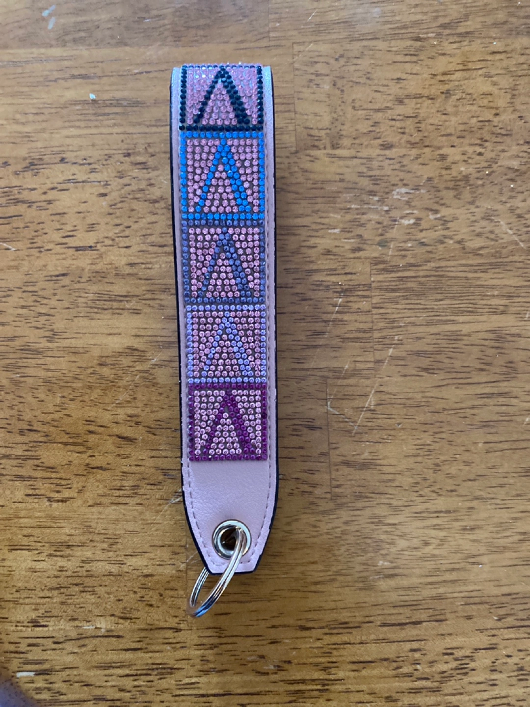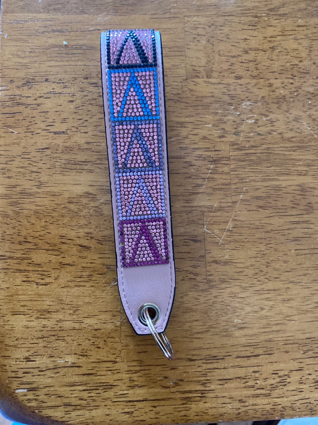 Pretty pink leather keychain. Features colorful rhinestone accents. Great for bags or keys.