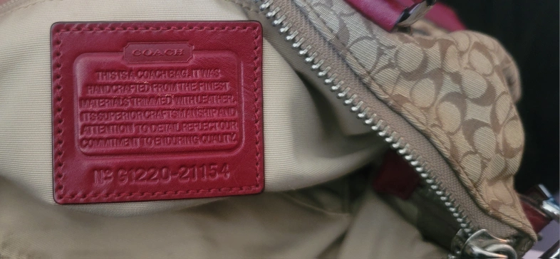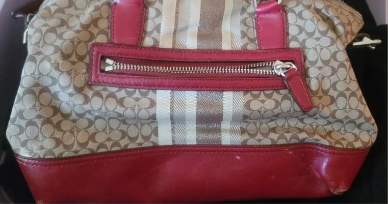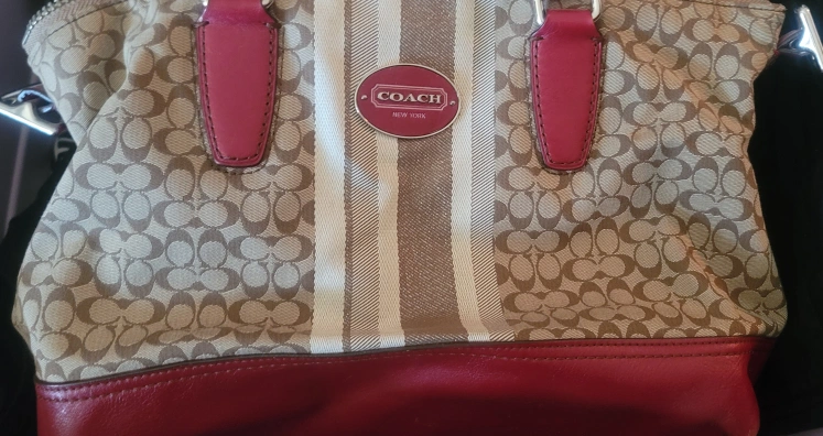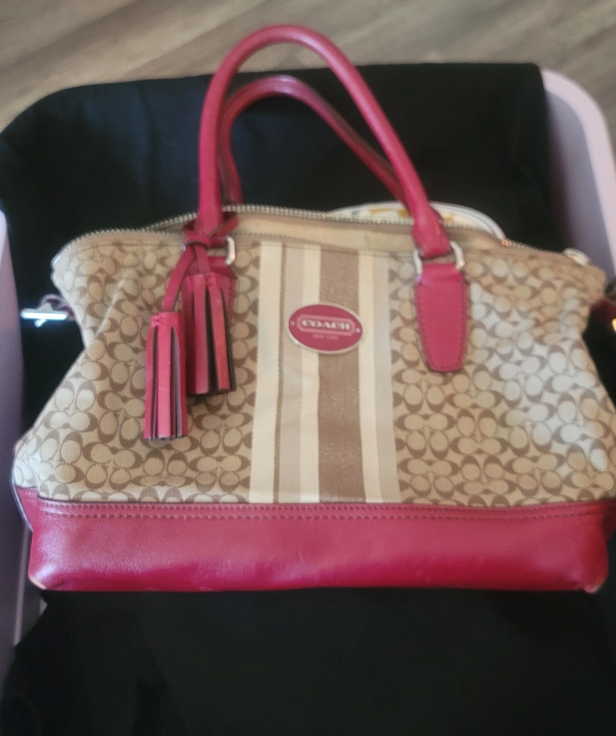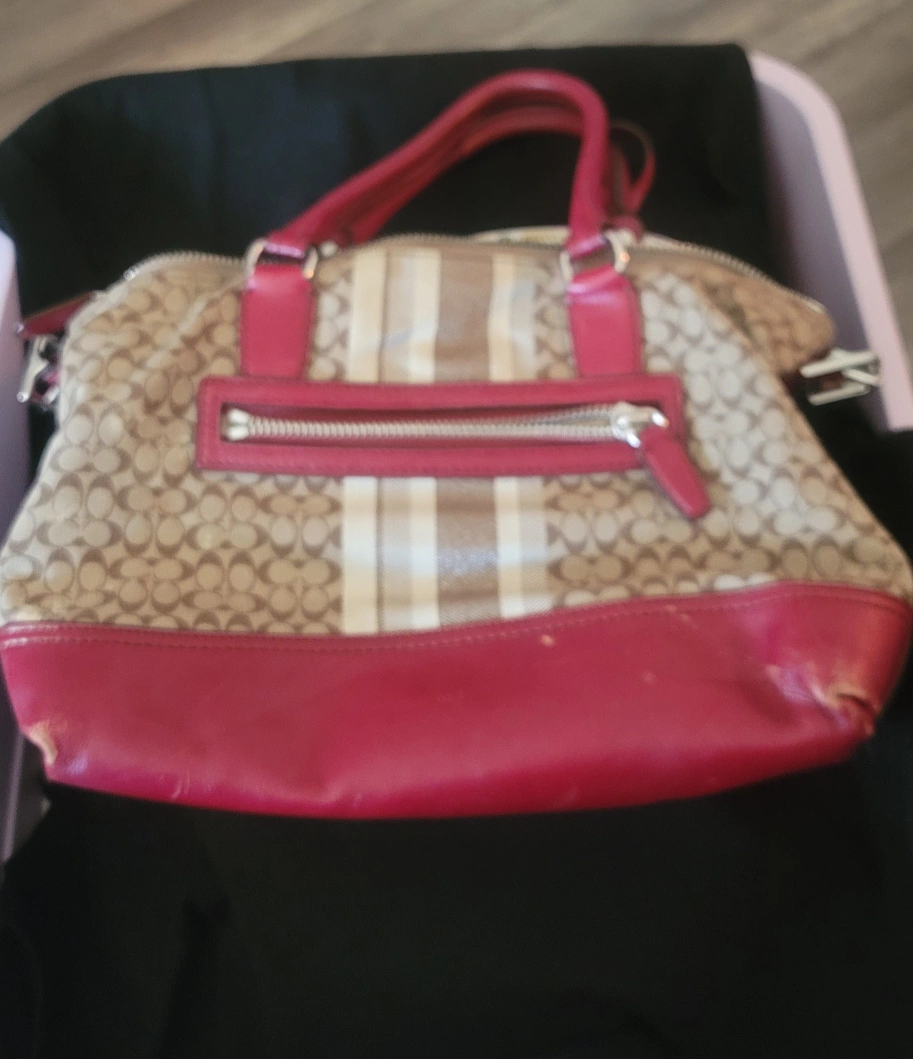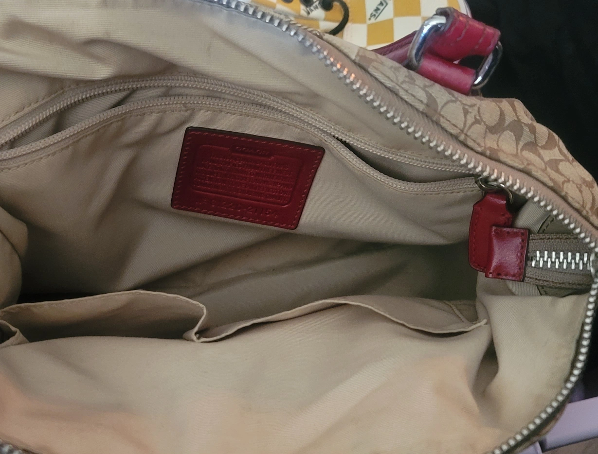 Coach handbag. Red leather trim. Beige signature canvas. Top handles. Zip closure. Interior pockets. Pre-owned.