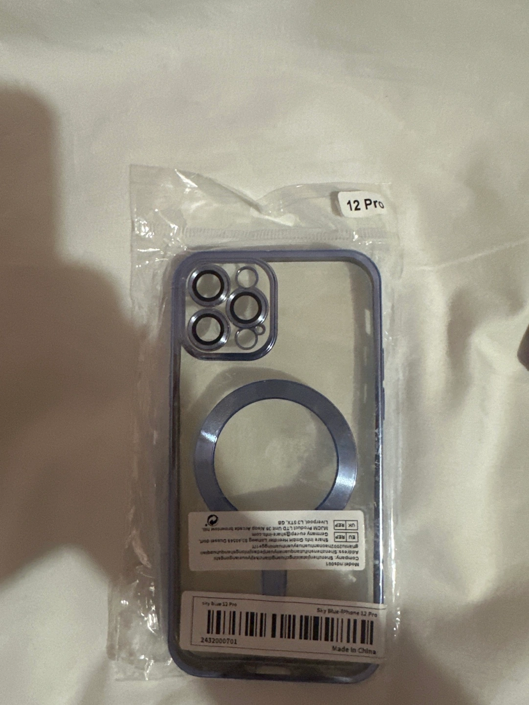 282Clear phone case with a metallic blue ring. Designed for iPhone 12 Pro. Made in China.