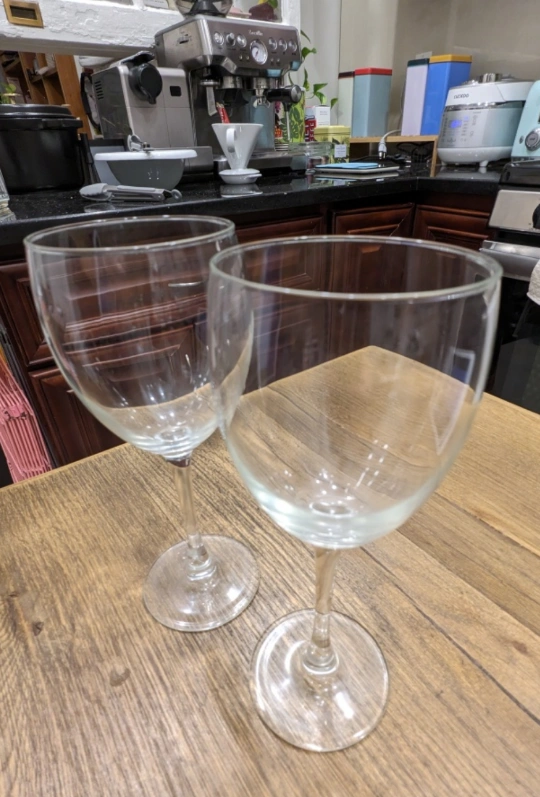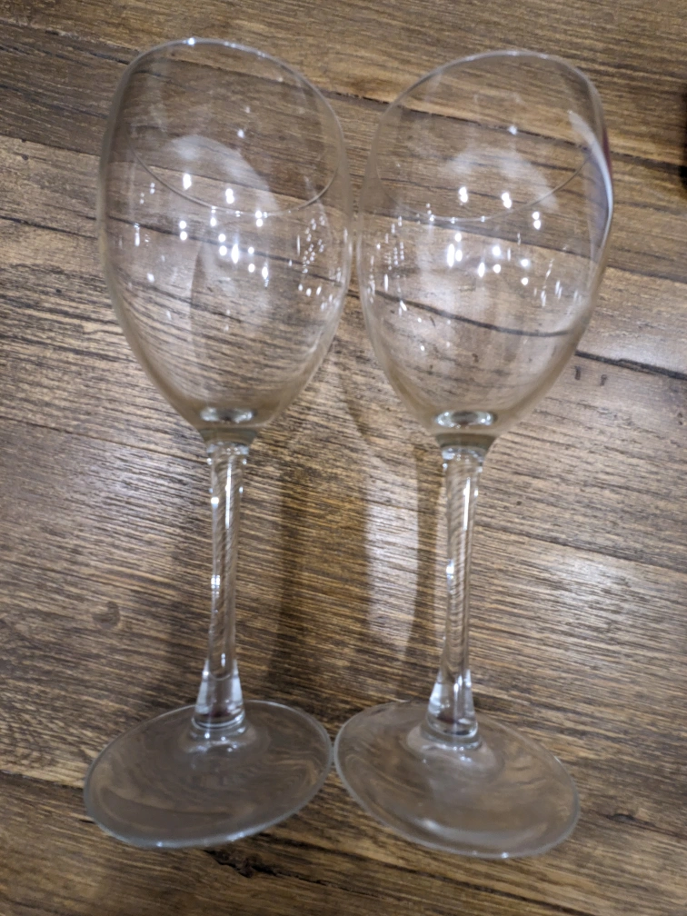 893Two elegant wine glasses. Perfect for everyday use or special occasions. Simple design, clear glass. Pick up only.