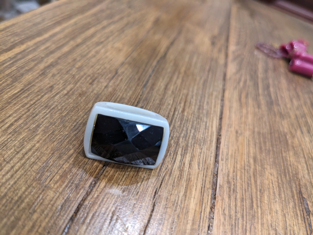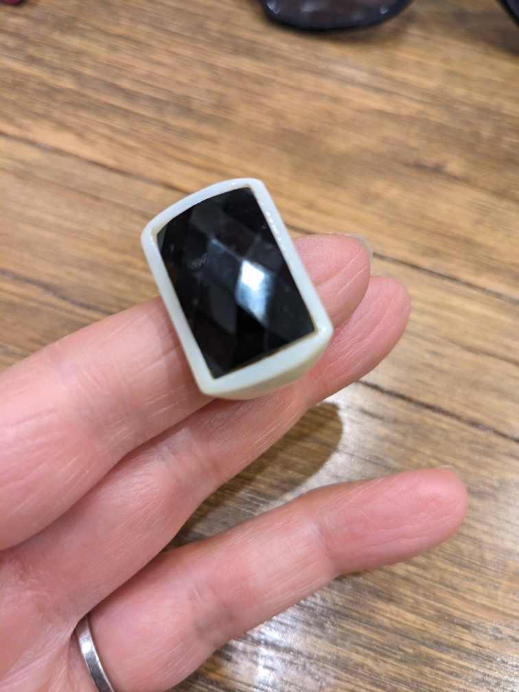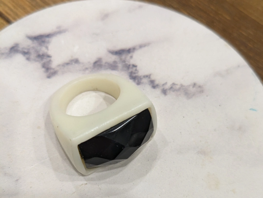 893Modern ring. Features a rectangular black stone. Off-white band. Eye-catching accessory. Perfect for adding a touch of flair to any outfit. Pick up only.