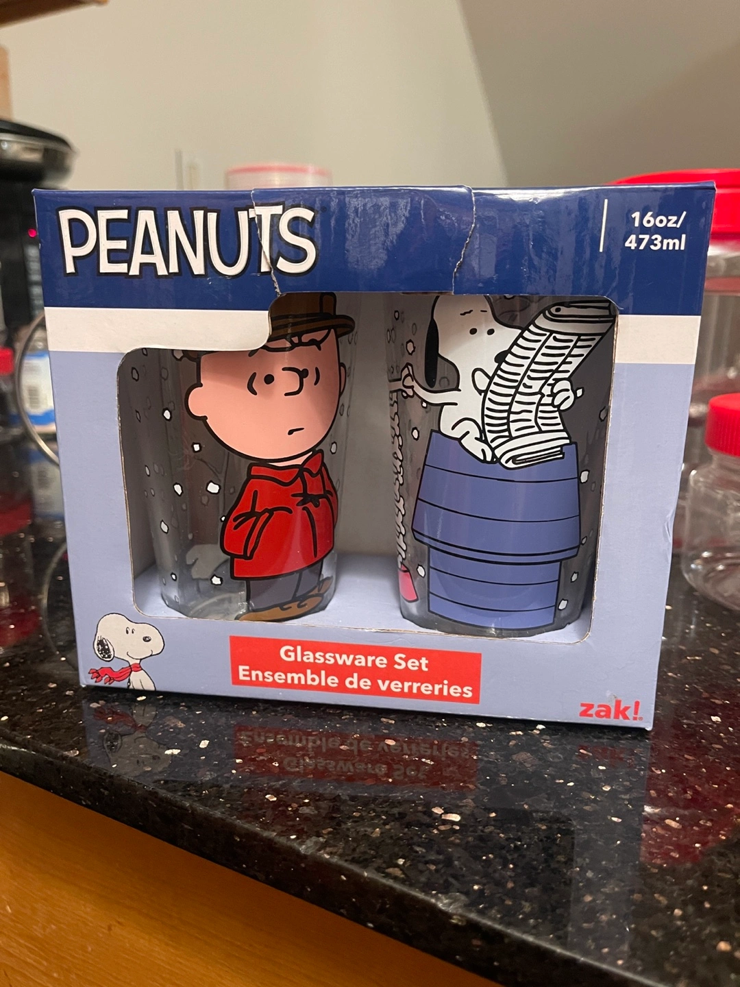 352New Peanuts glassware set. Features Charlie Brown and Snoopy. Two 16oz glasses included. Zak! brand.