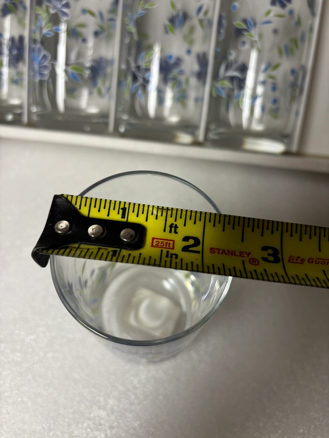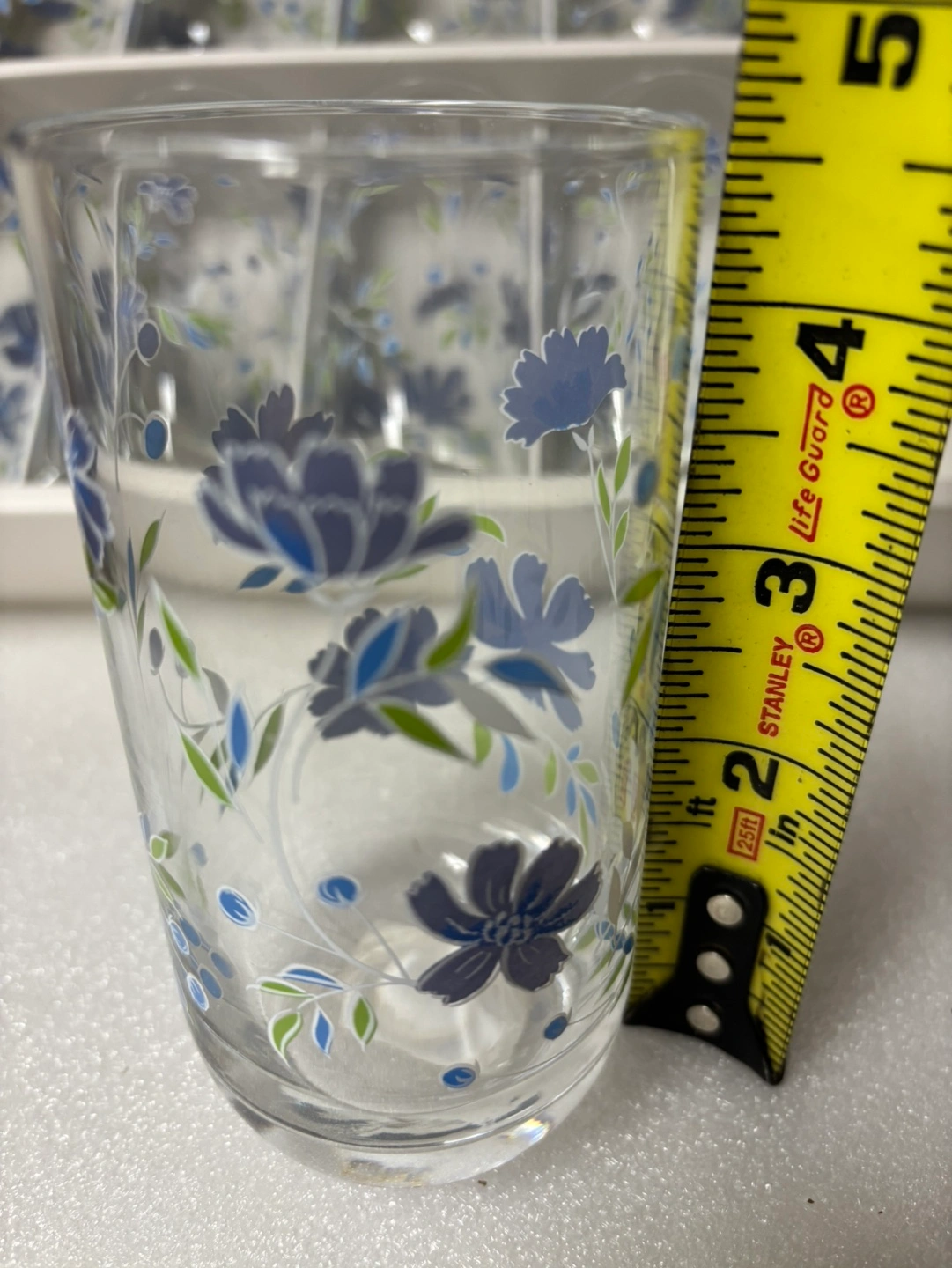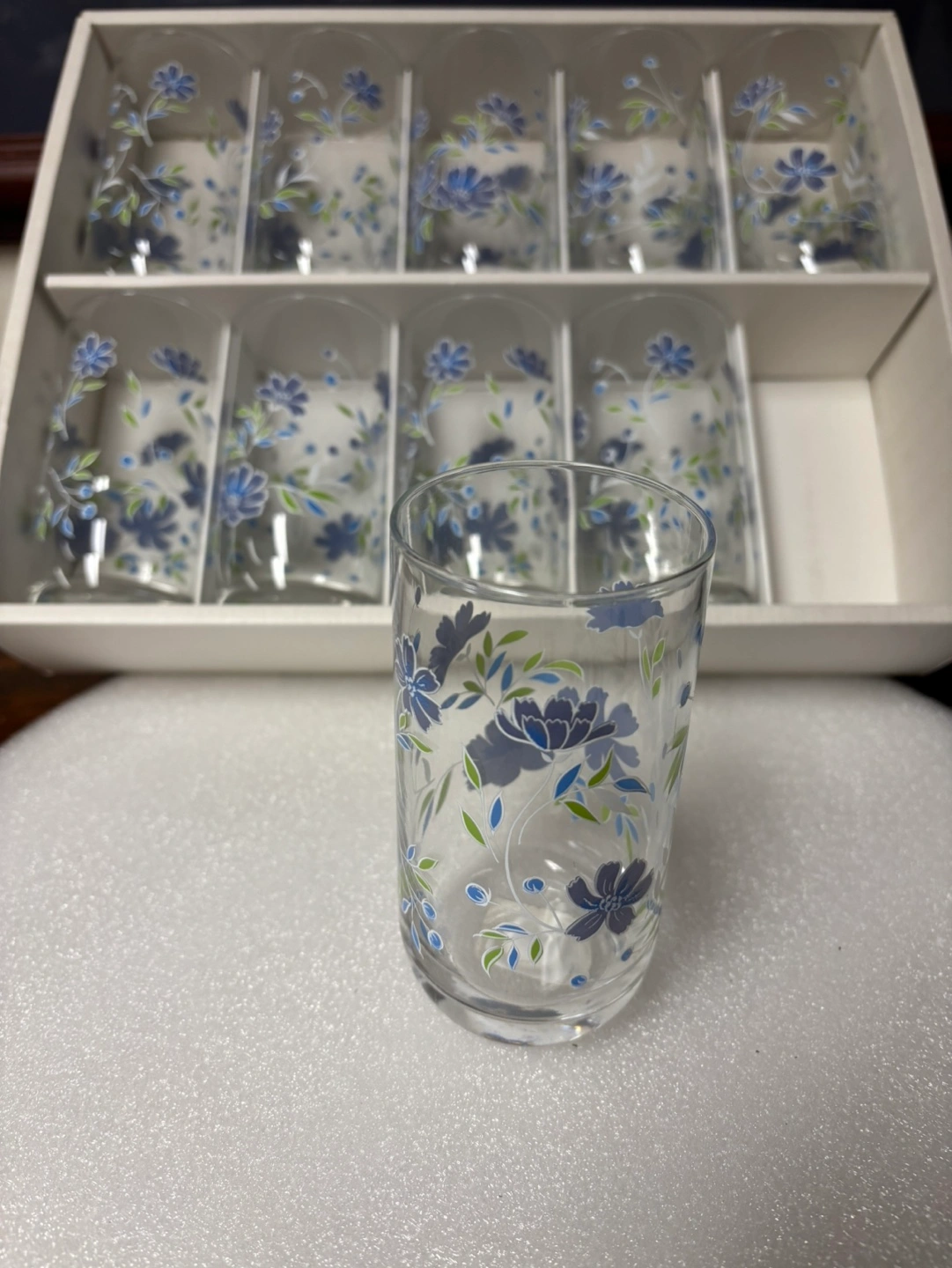 91Set of twelve glasses. Clear glass with blue and green floral pattern