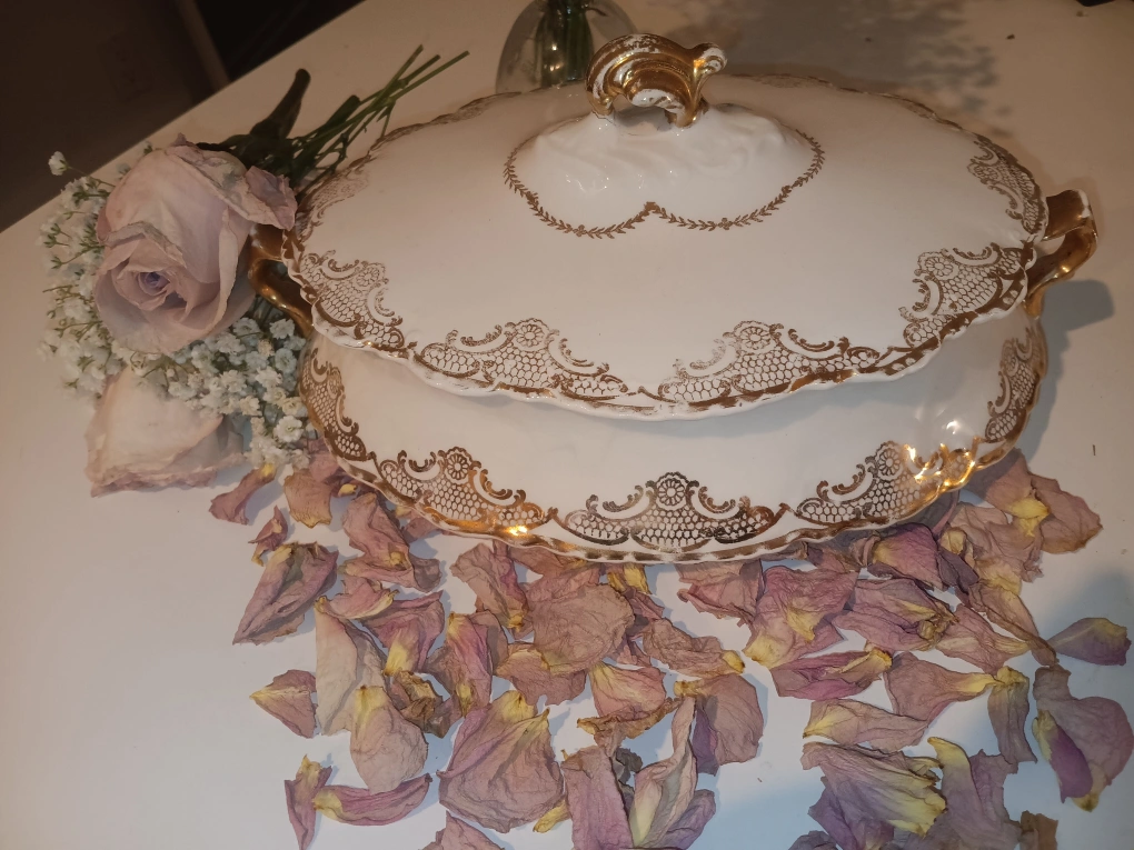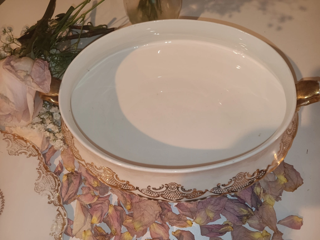 Beautiful antique covered casserole dish. Gold detailing. Oval shape with handles. Perfect for serving or display.