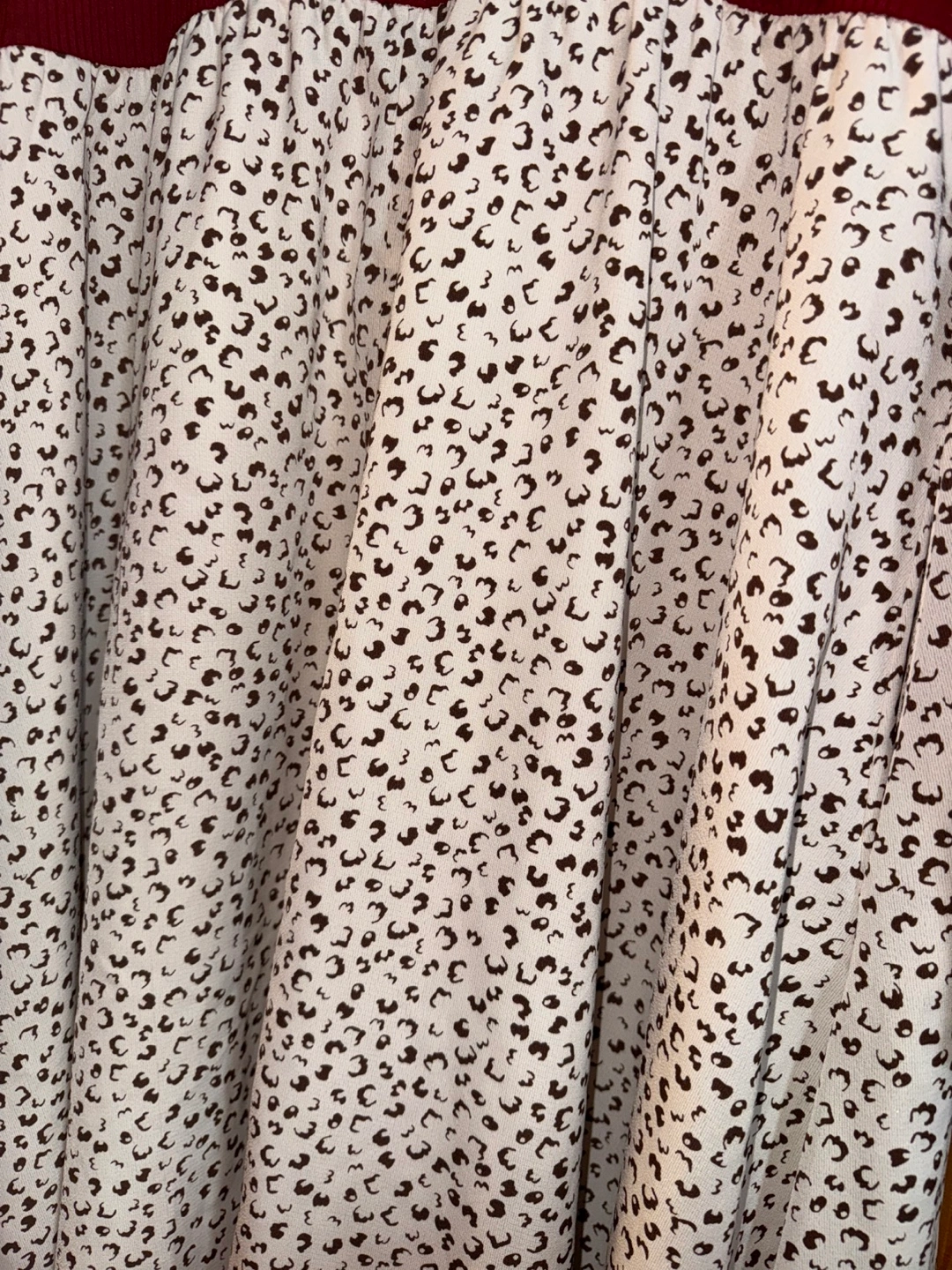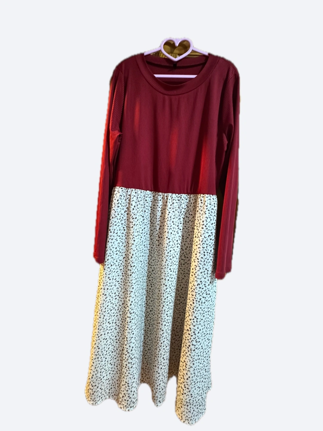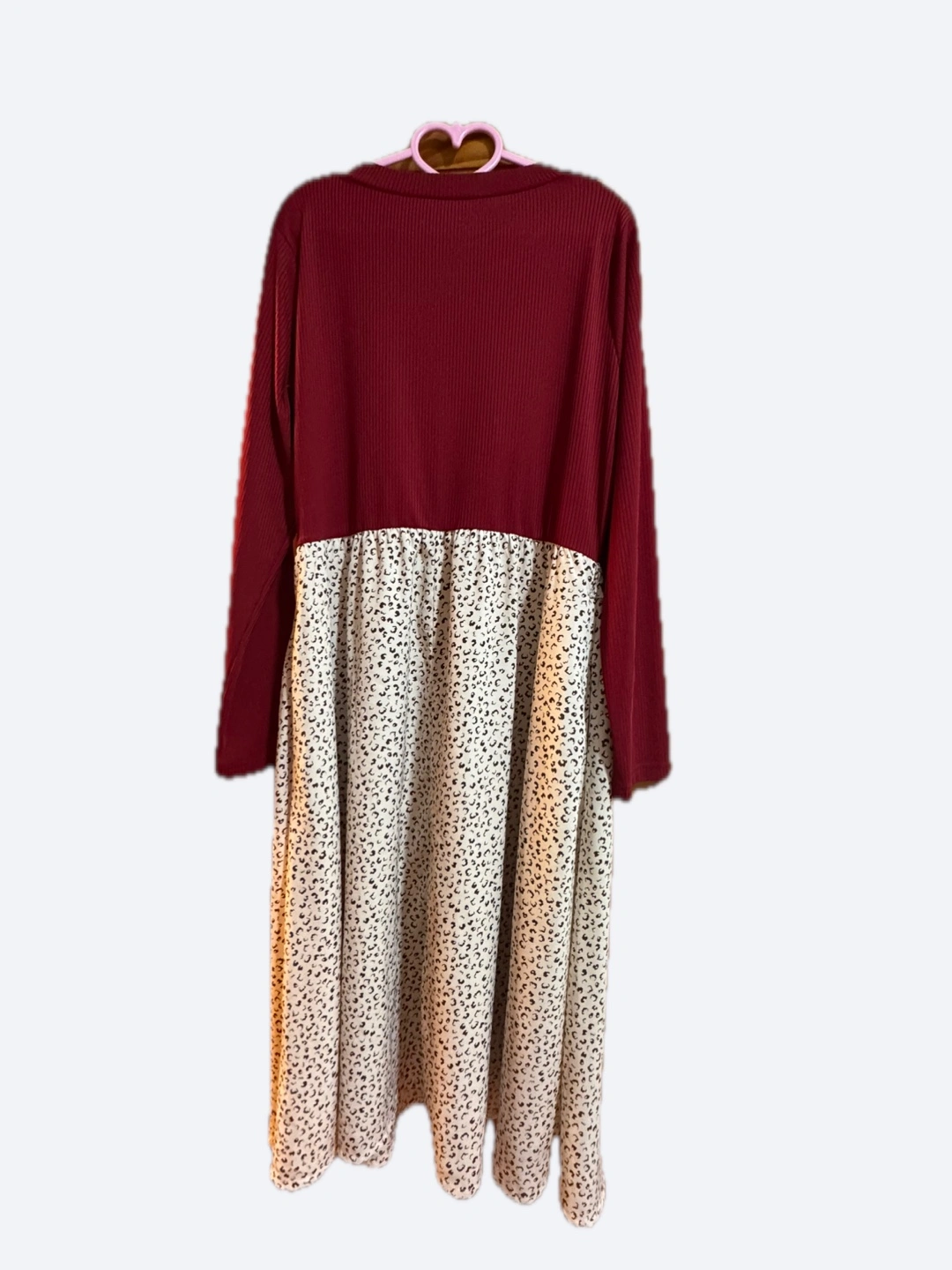Long sleeve midi dress. Maroon ribbed top, beige bottom with brown leopard print. Casual style. Perfect for everyday wear.