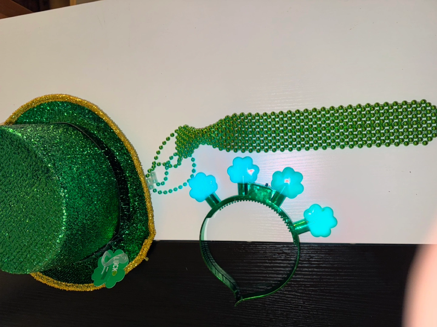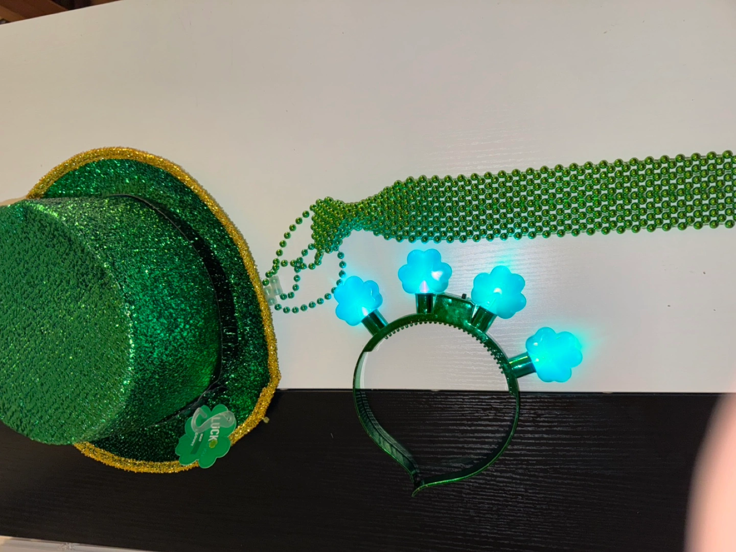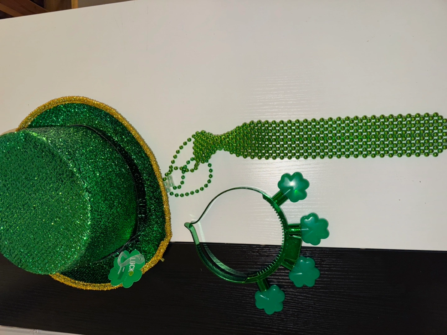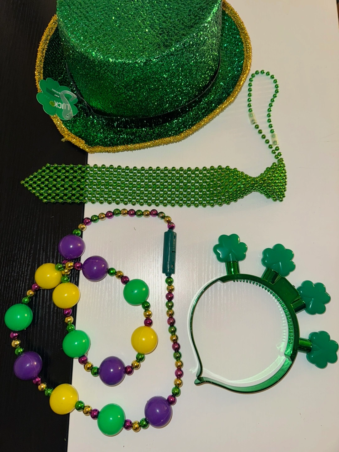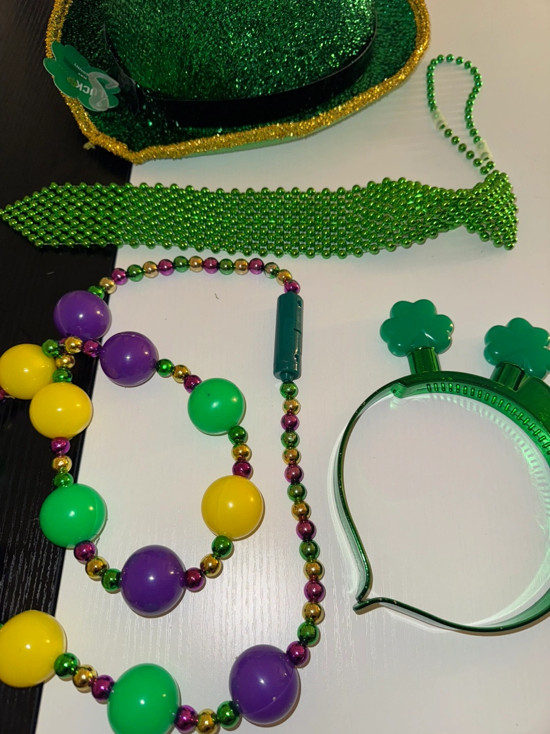 Green glitter top hat, green beaded tie, green shamrock headband, and Mardi Gras-style beaded necklace. Perfect for St. Patrick's Day celebrations.