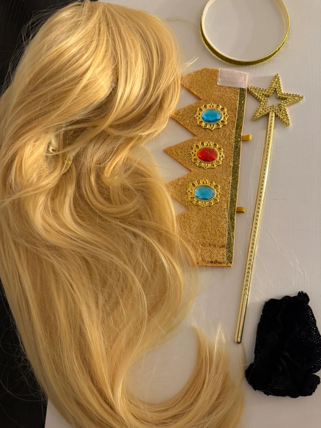 Long blonde wig, gold glitter crown with jewels, gloves, gold star wand, and earrings. Perfect for dress-up or cosplay.