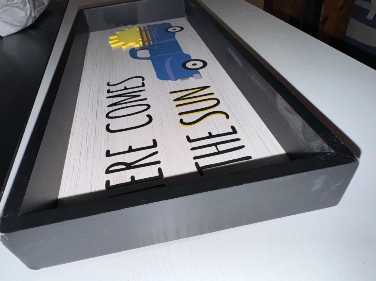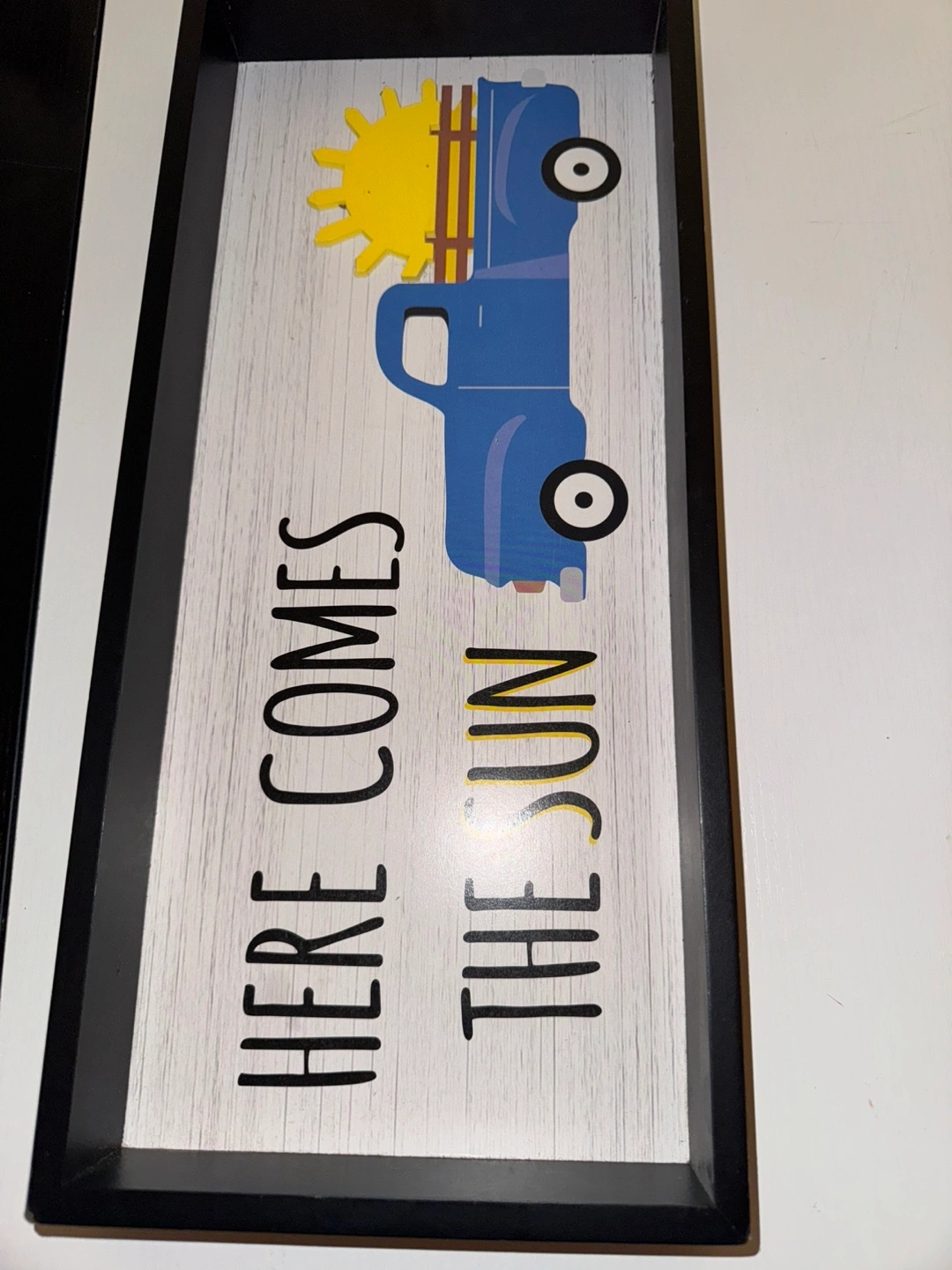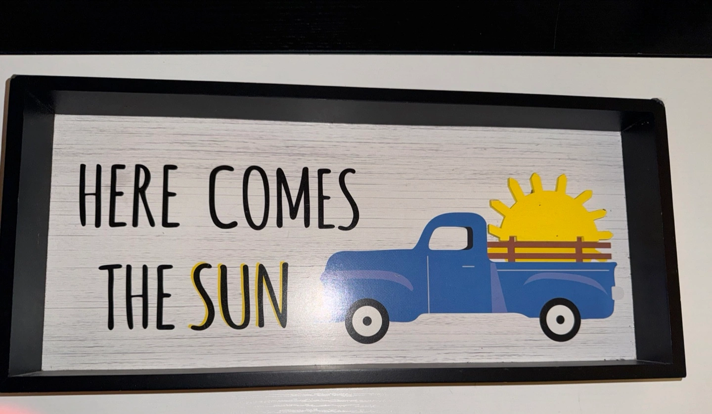 A blue pickup truck carrying a sun with the text "Here comes the sun."