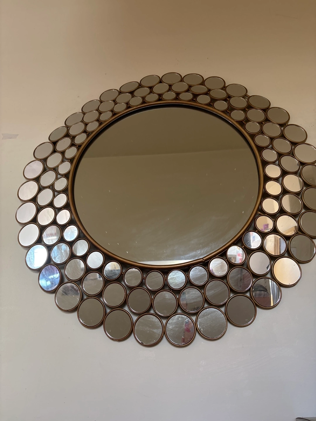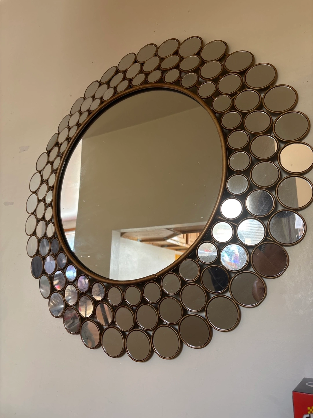 Large round mirror. Gold frame. Many small mirrors surround the main mirror. Beautiful accent piece for any room.