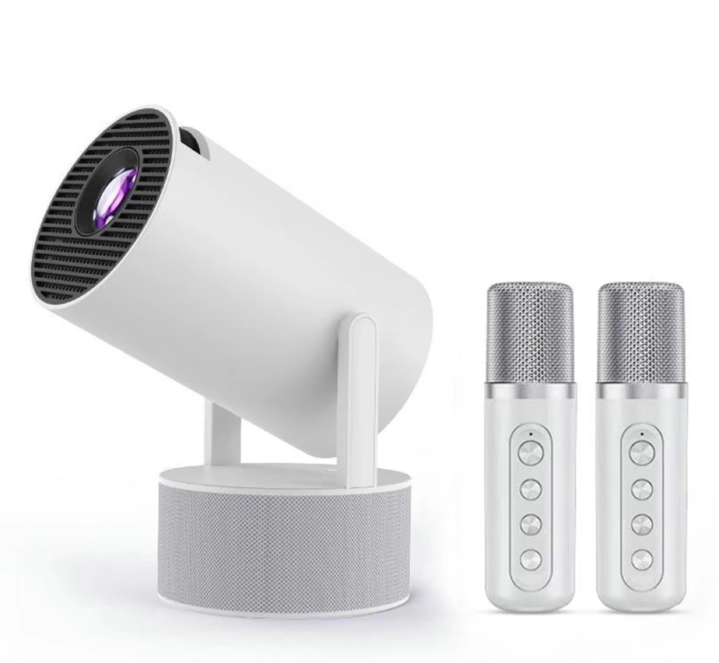 Home entertainment projector. Plug and play wireless. Stereo. Karaoke projector for home or office. 270 degree rotatable. Android 11.0 OS. 1080p. 300 ANSI lumens. LED lamp. Includes two microphones and remote.