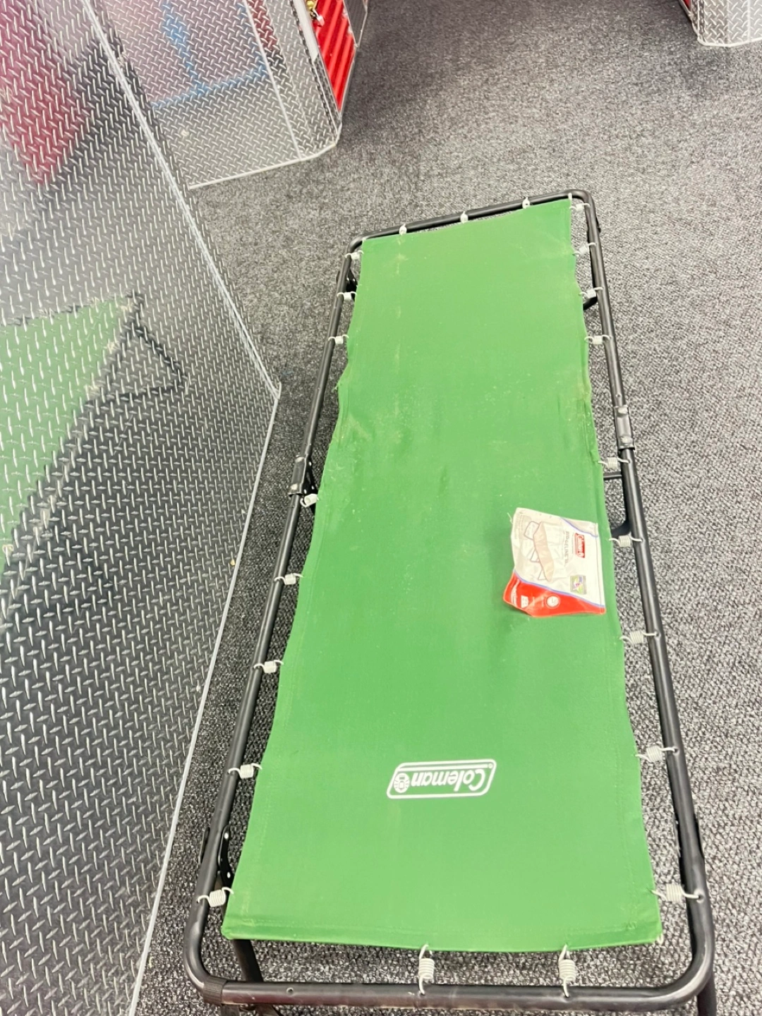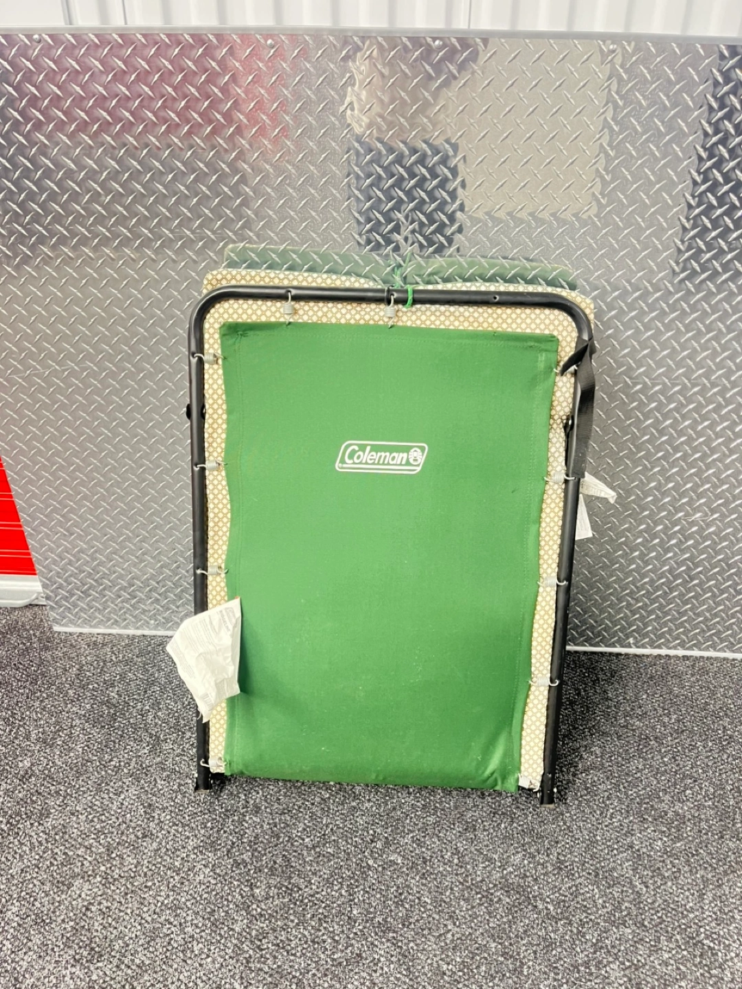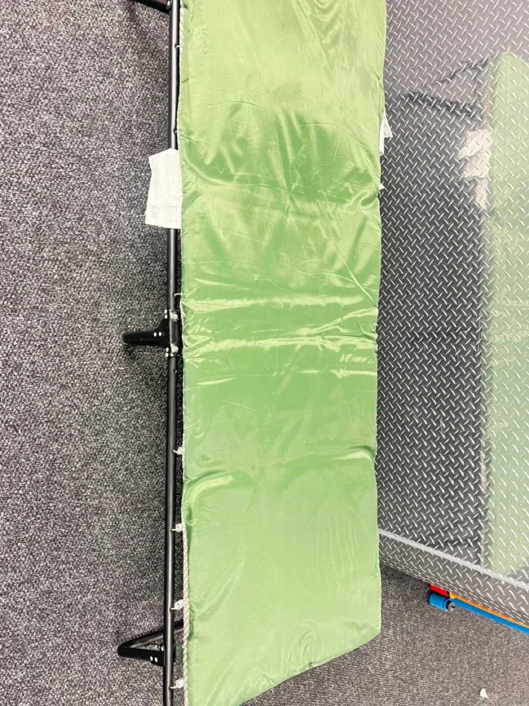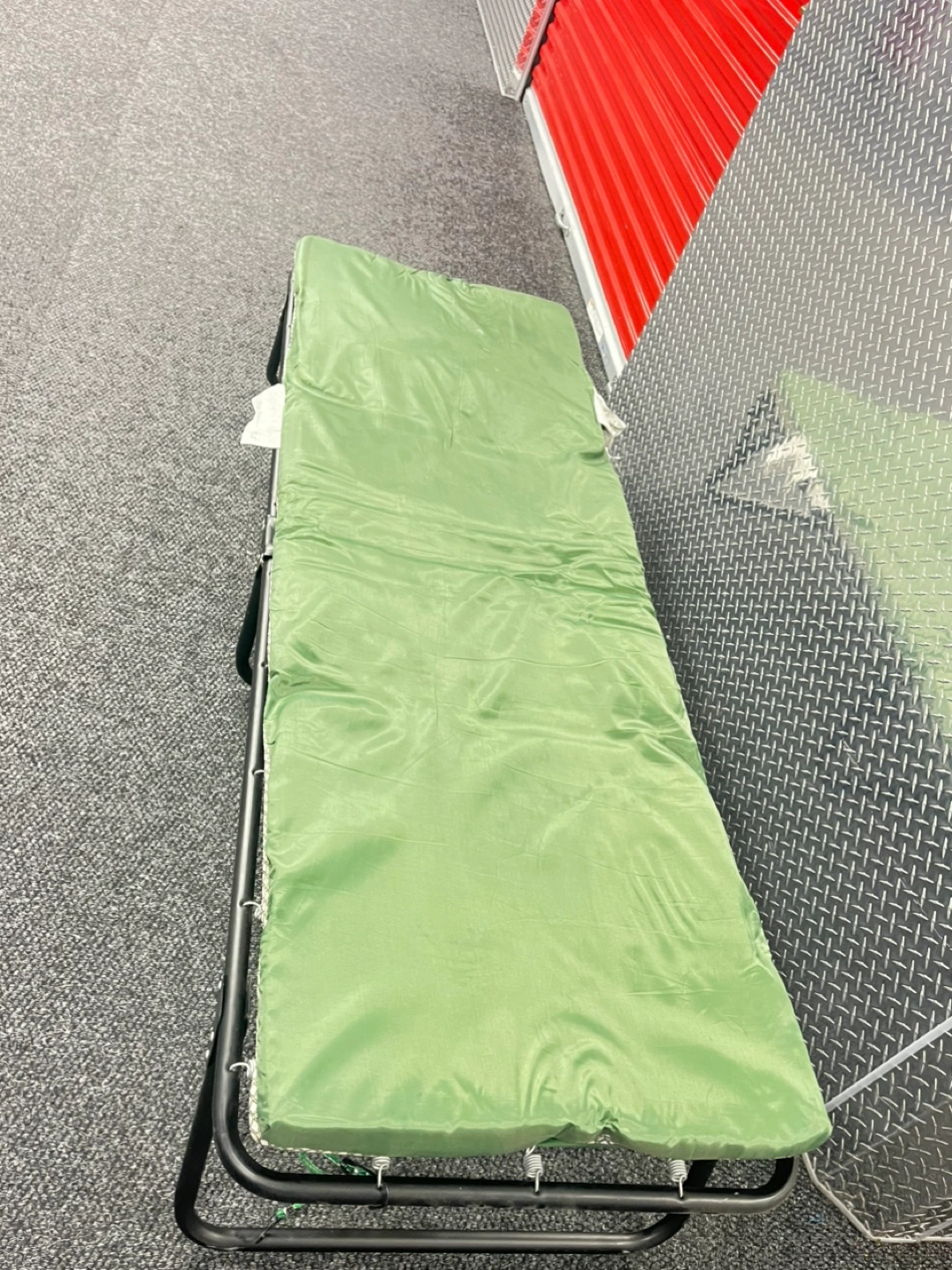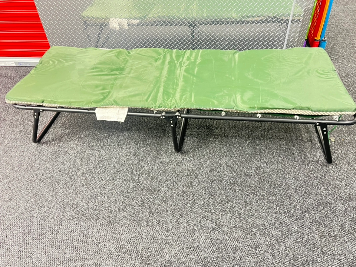 Portable cot, folds flat. Green fabric, black metal frame. Great for camping or guests.