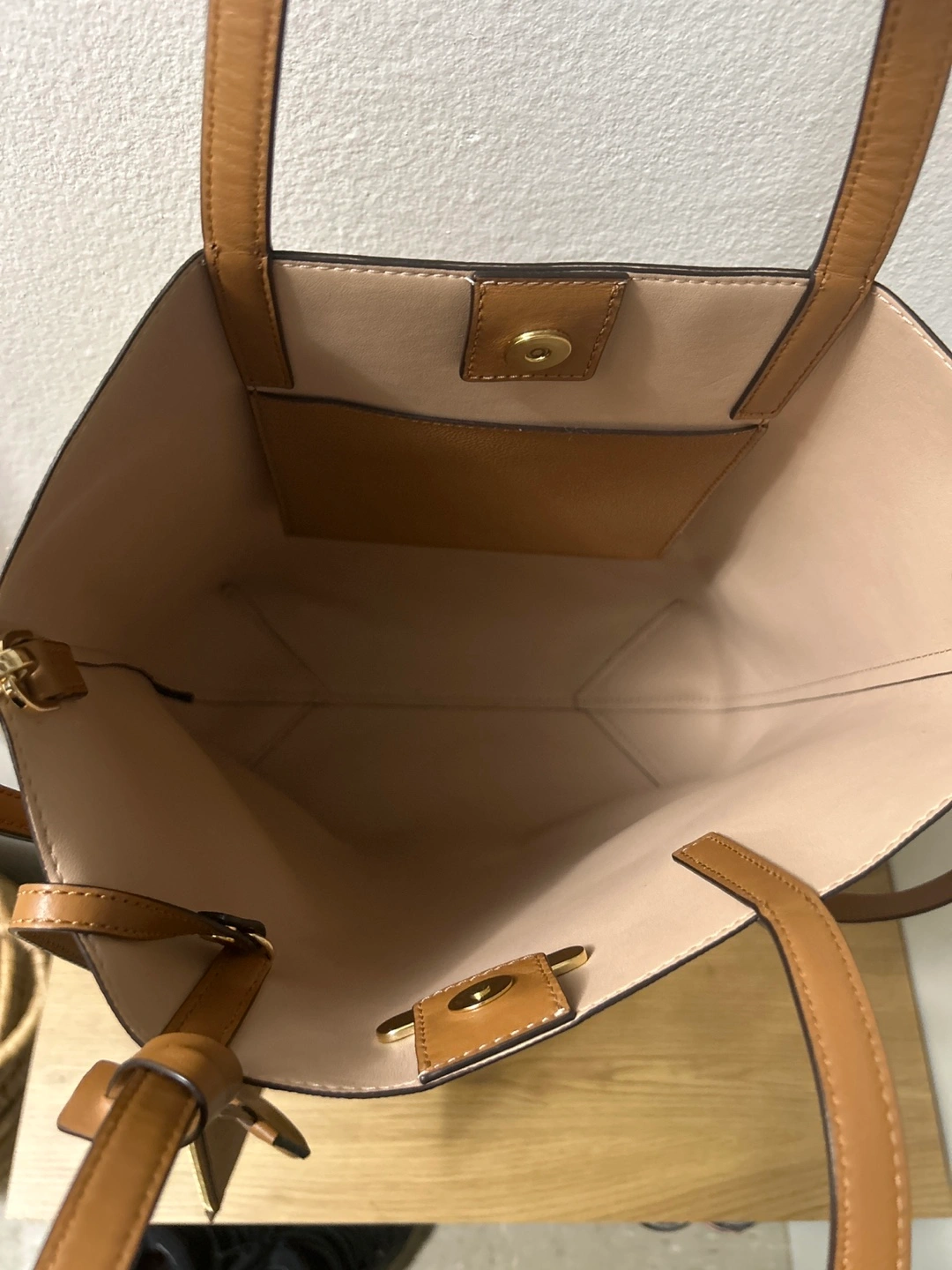 Brown leather tote bag. Features a detachable crossbody strap and zipper closure. Includes a matching wristlet. Great for everyday use.