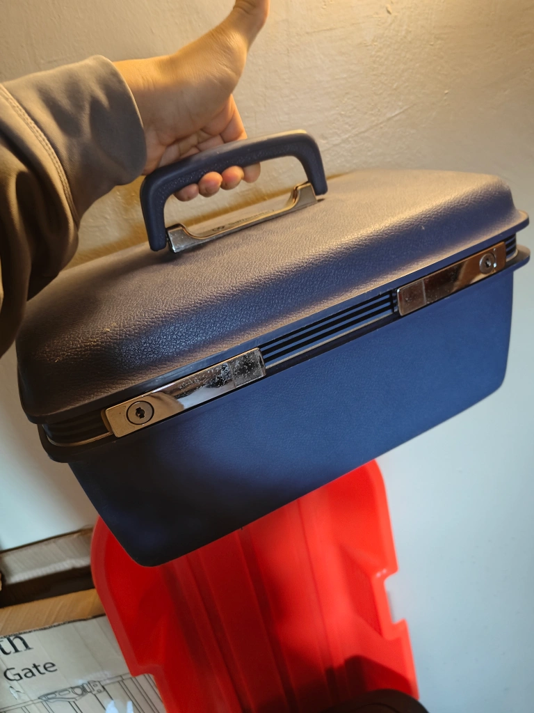 Hard-shell suitcase, blue, vintage style. Features a handle and latches. Great for travel or storage.