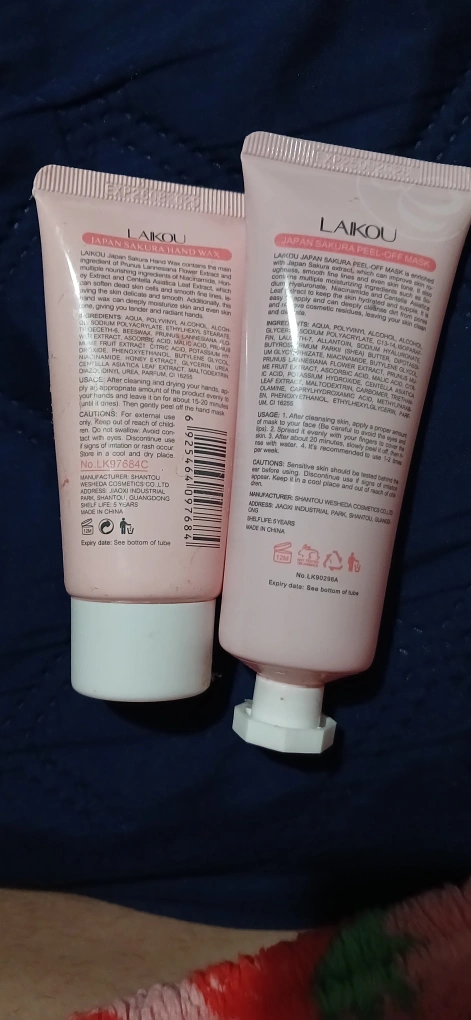 1000+Two tubes of LAIKOU skincare products. One is hand wax, the other a peel-off mask. Both are Japan Sakura scented. used. #freecycle I'm giving this purchase, because it doesn't work in my skin
